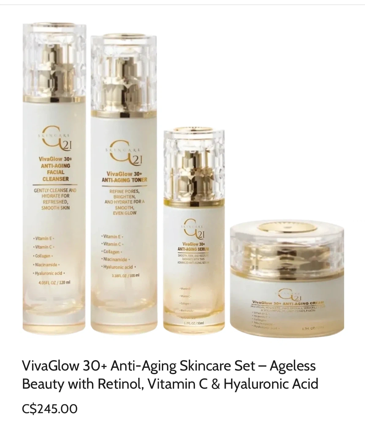 26I'm selling a VivaGlow 30+ Anti-Aging Skincare Set! This set includes: - Facial Cleanser (4.05FL OZ/120 ml) - Anti-Aging Toner (3.38FL OZ/100 ml) - Anti-Aging Serum (1.7FL OZ/50ml) - Anti-Aging Cream (1.7FL OZ/50ml) Originally bought for $245.00! Sale Ends OCT / 31 $195 4164149088 Dr Nouraei