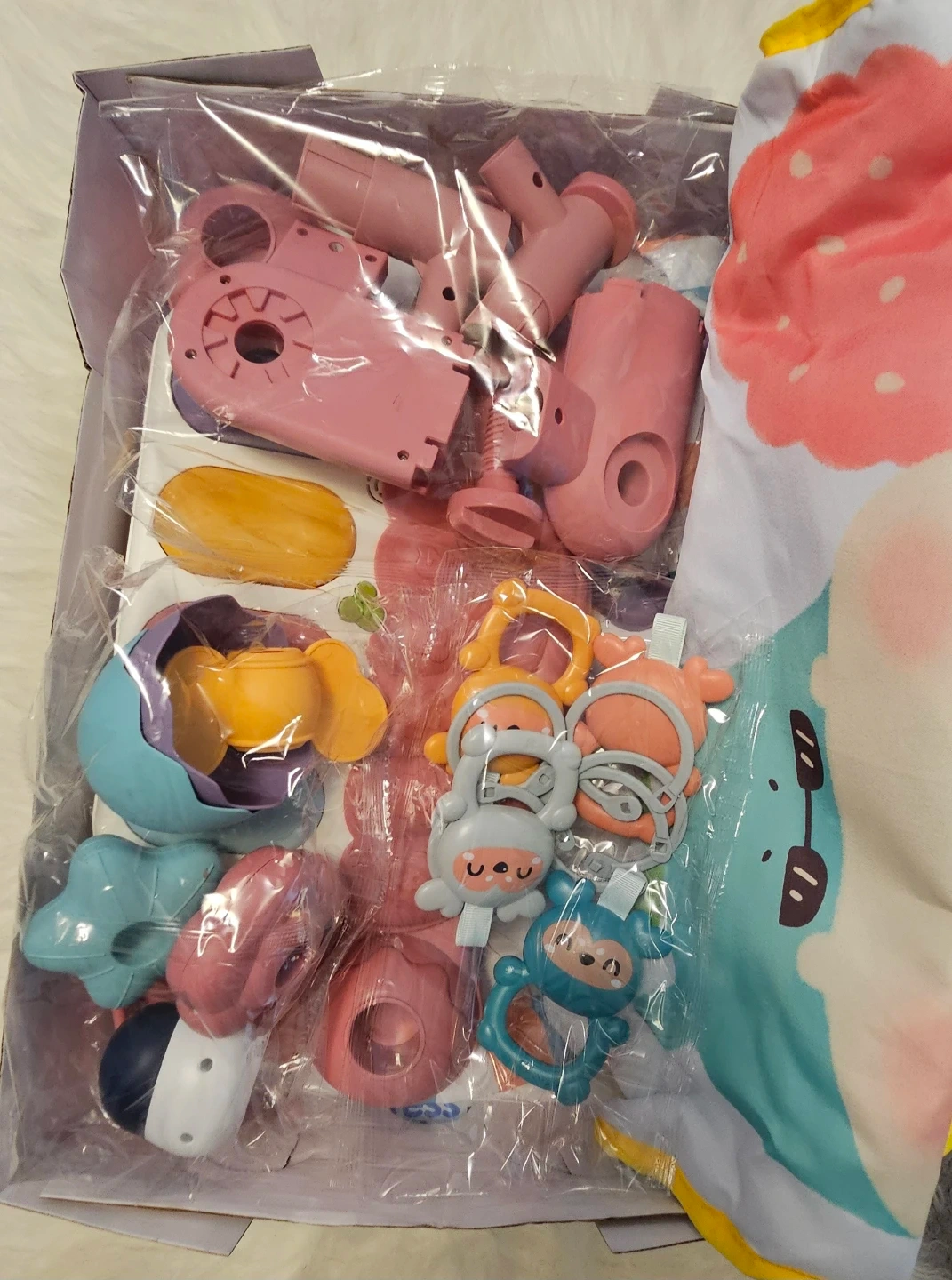 131VIVAKIDS Baby Fitness Blanket! It's a multi-function blanket designed for babies 0+ months. Comes with fun toys and a safety game fence! Includes a cute little mirror and fun pendants to keep your little one entertained. -New, Open Box, Toys still in sealed bags. -Red Orange