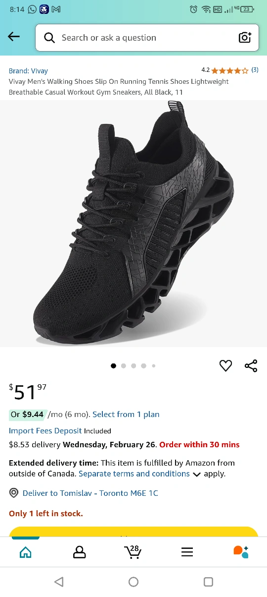 Vivay Men's Black Running Shoes - Size 41