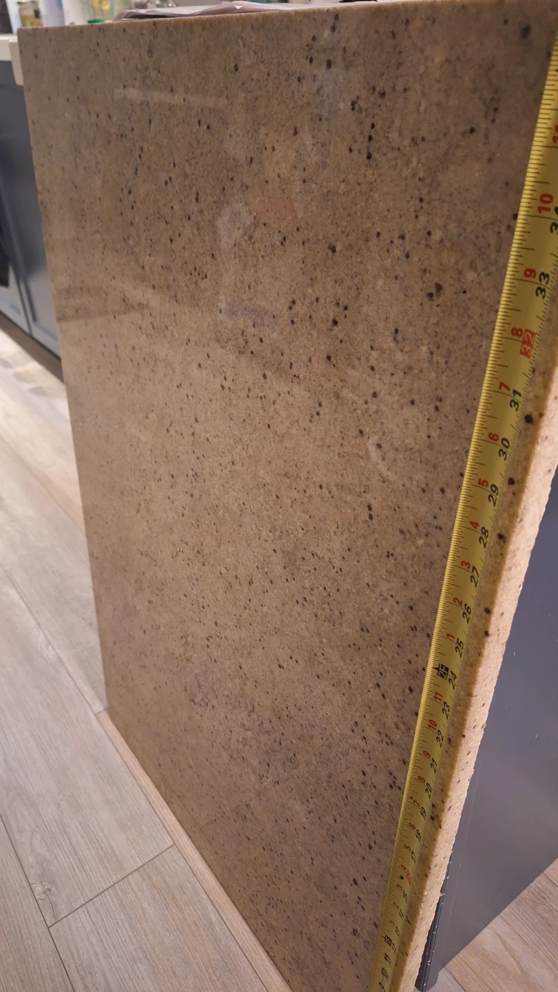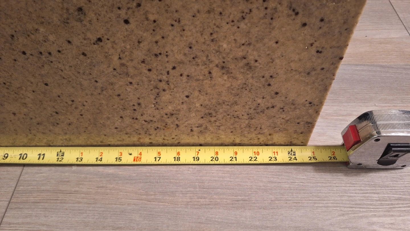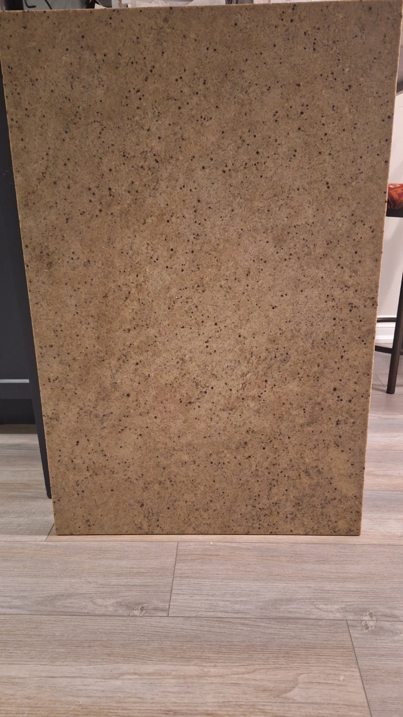 25" x 37 1/8" x 3/4" granite slab in a medium beige fleck pattern. Finish is glossy. Edges need to be refinished. Perfect for your next kitchen/bathroom project.