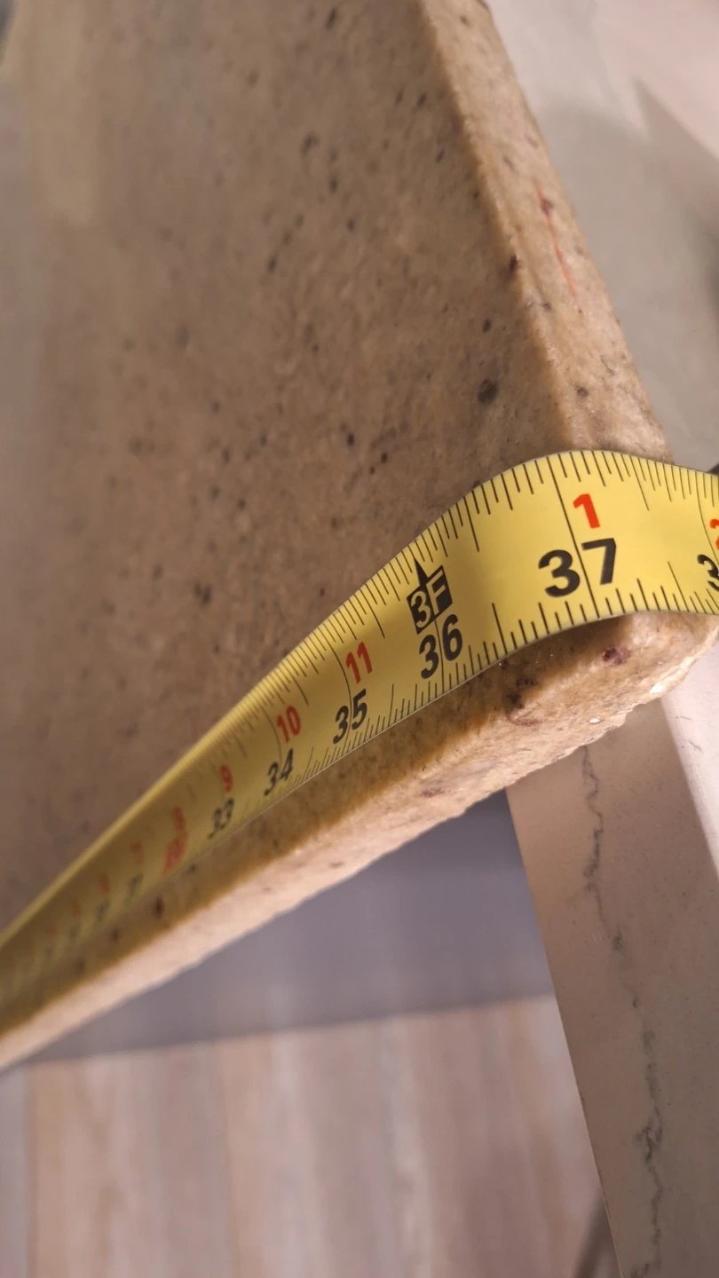 25" x 37 1/8" x 3/4" granite slab in a medium beige fleck pattern. Finish is glossy. Edges need to be refinished. Perfect for your next kitchen/bathroom project.