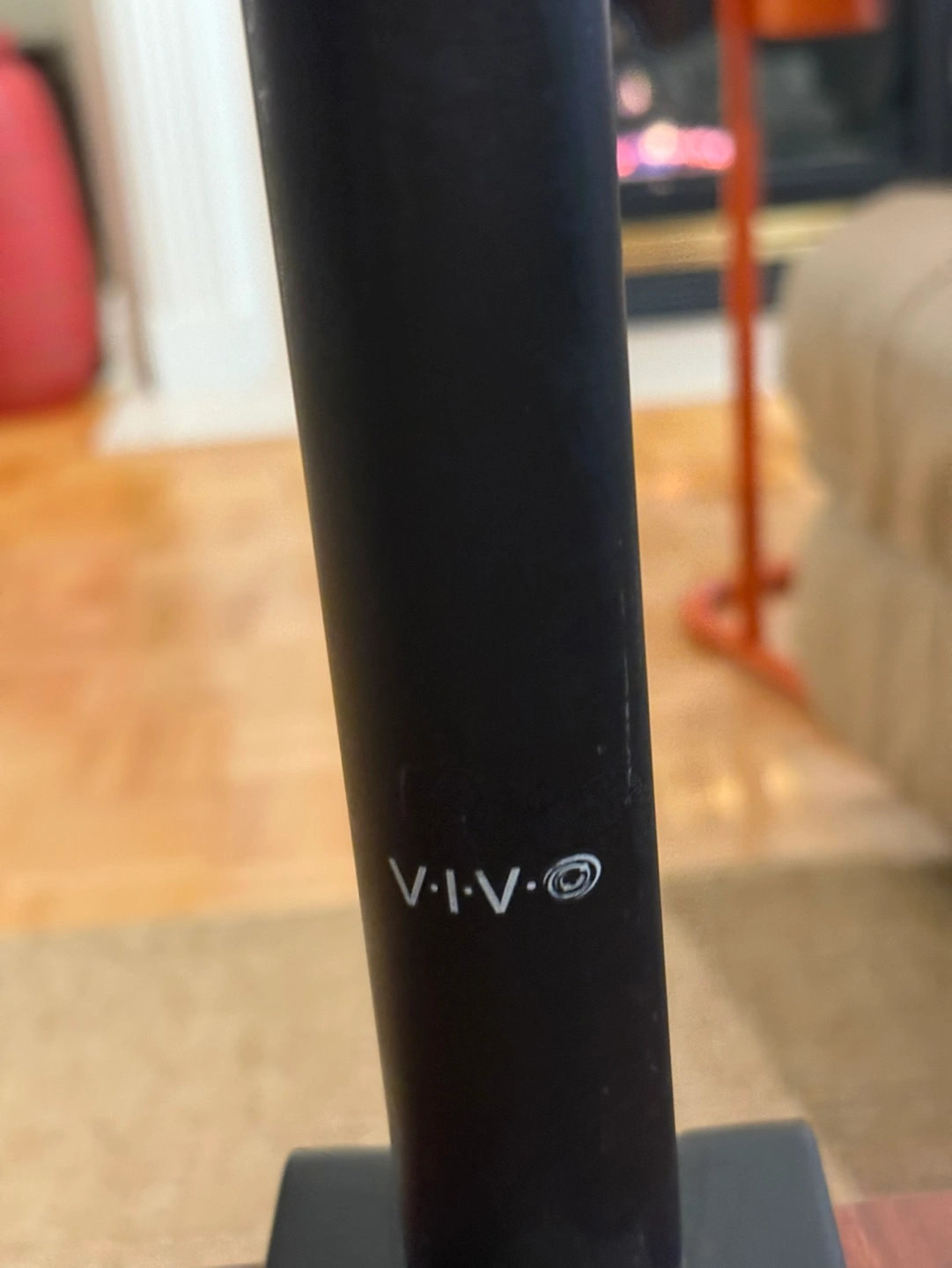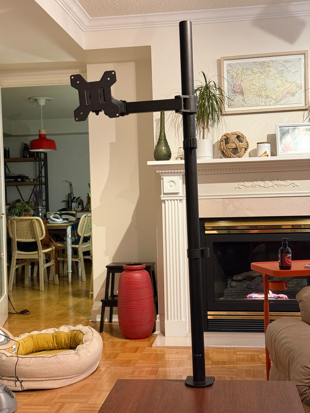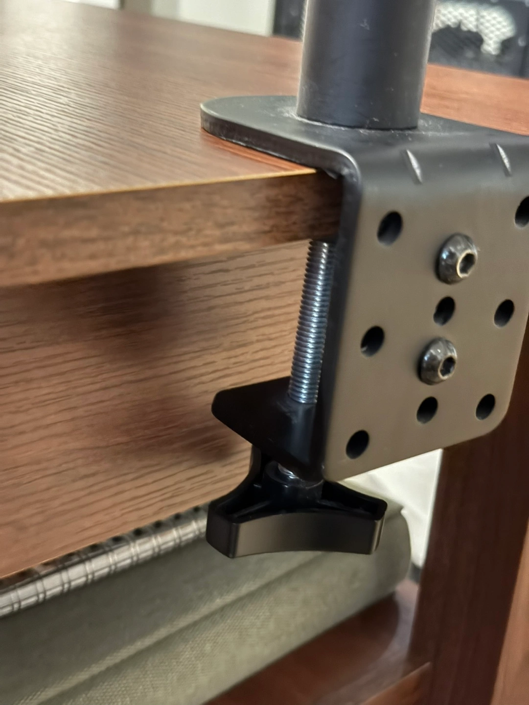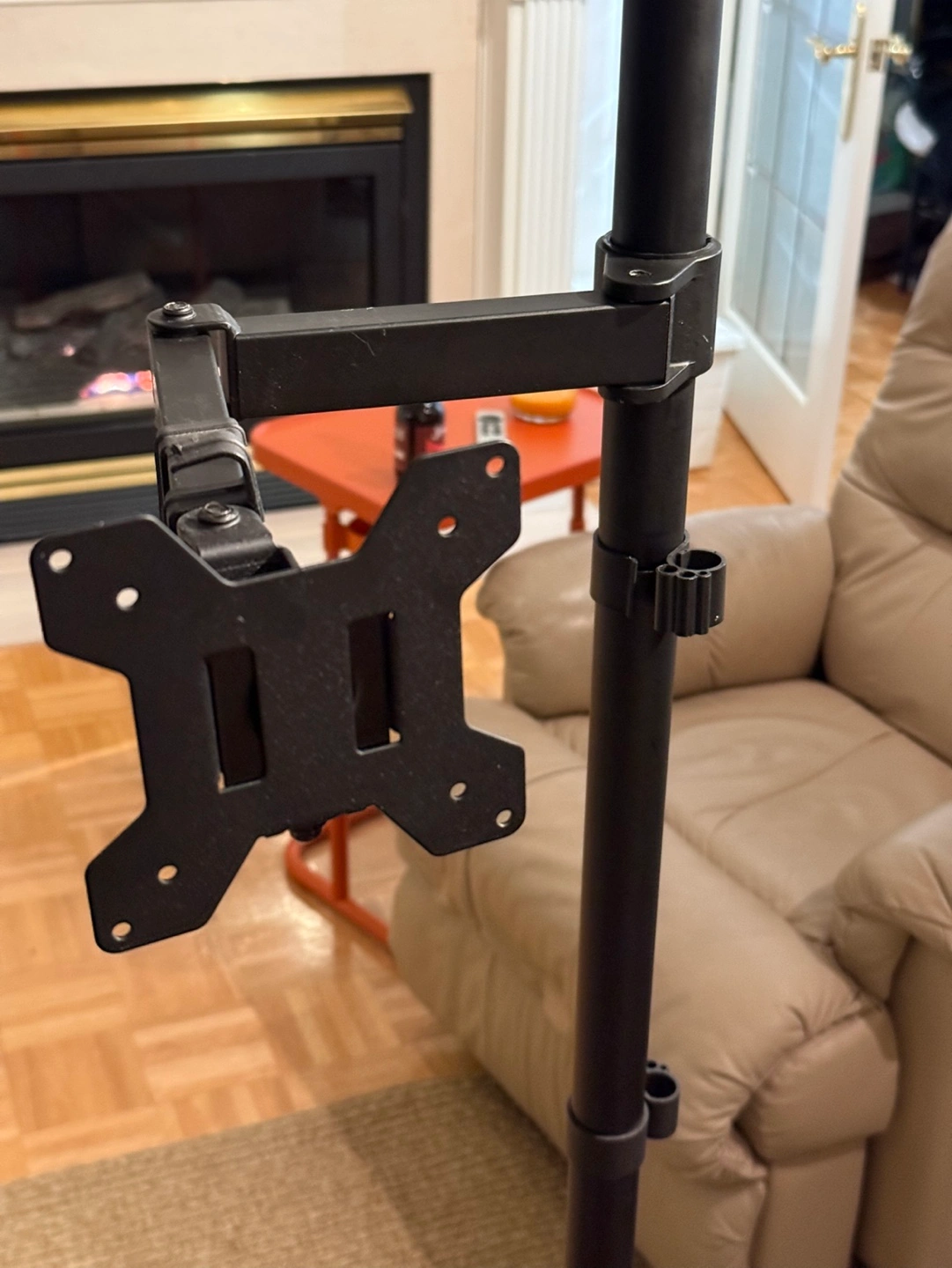 Black monitor stand. Attaches to desk with C-clamp. Adjustable height and arm positioning. Suitable for most monitors. Extra tall