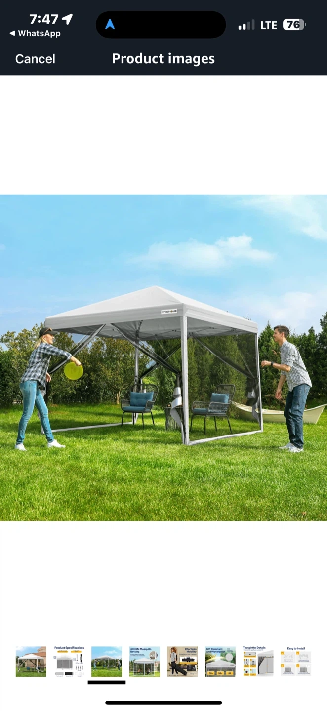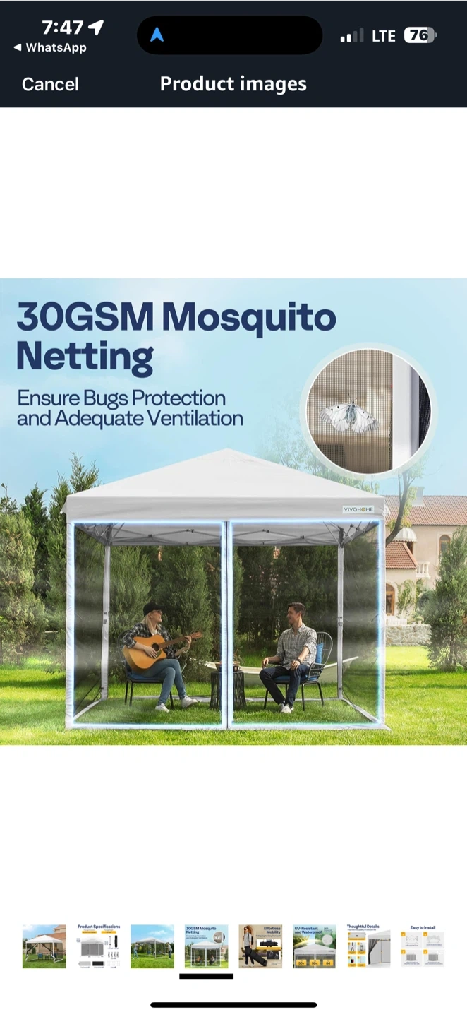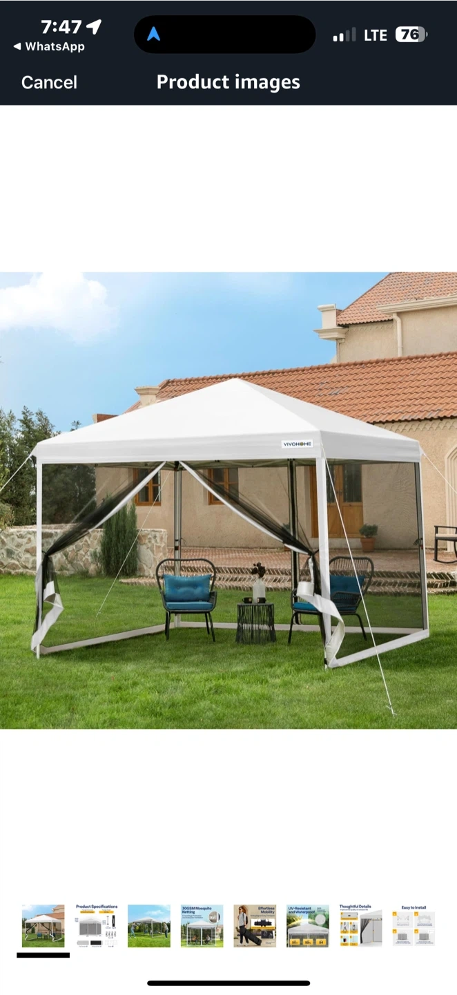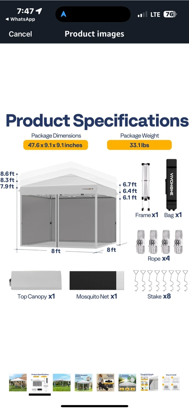 Selling a VIVOHOME 8x8 ft pop-up canopy tent, perfect for outdoor gatherings! It comes with mosquito netting to keep those pesky bugs away. Key features: - Package dimensions: 47.6 x 9.1 x 9.1 inches - Package weight: 33.1 lbs - Includes frame, bag, rope, stakes, top canopy, and mosquito net - Effortless mobility with a rolling bag for easy transport