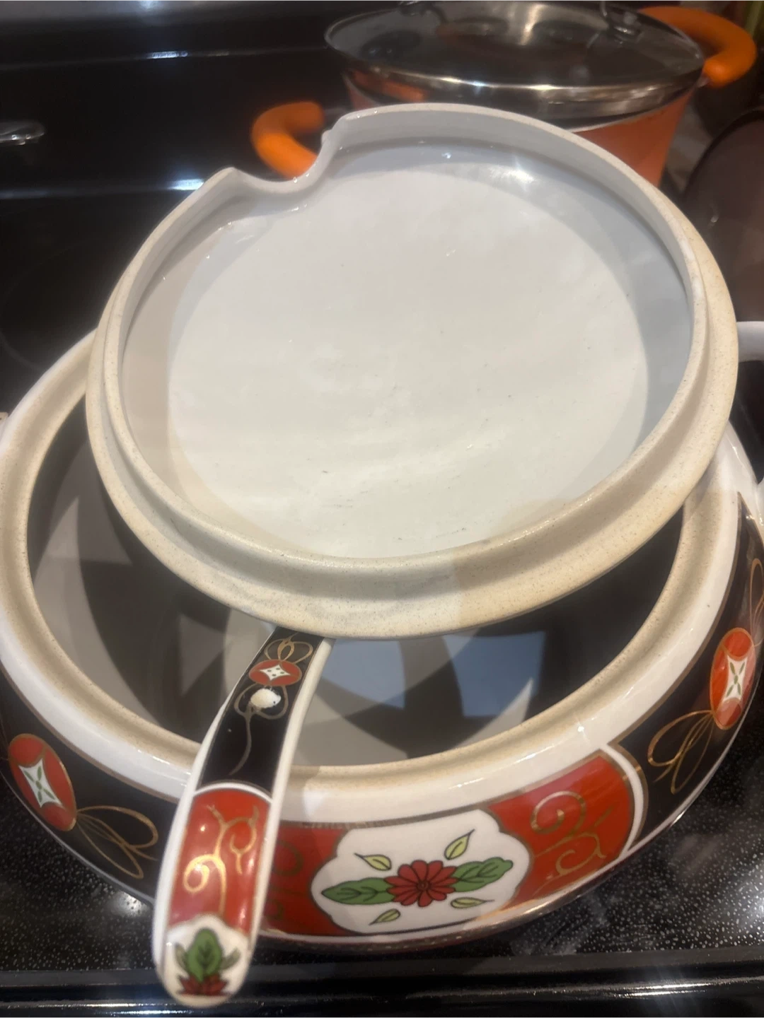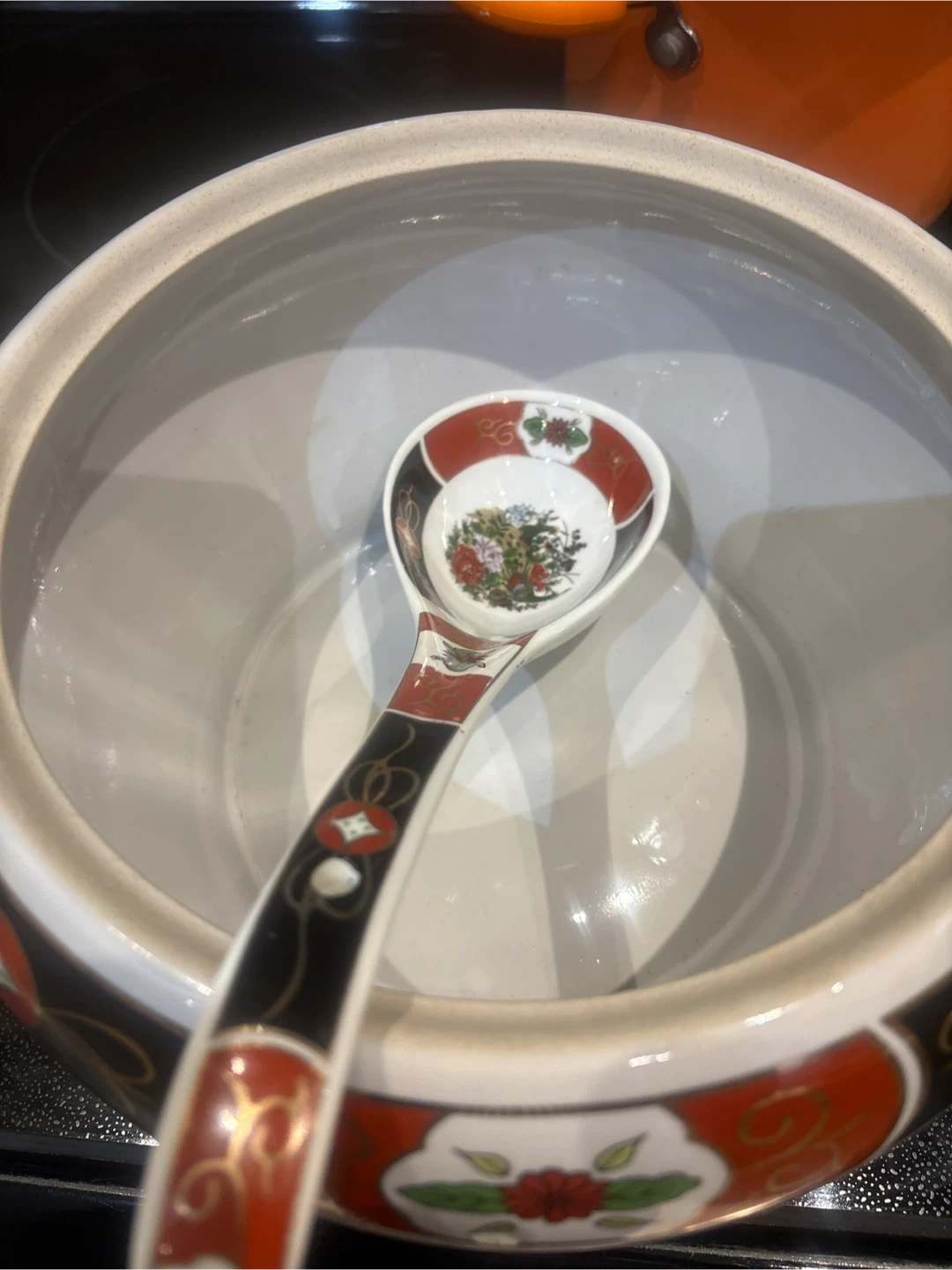 This is a vintage Imari design ceramic tureen with a matching ladle. It features a colourful floral and scenic pattern. The tureen has two handles and a lid with a small knob. Approx 45 years old