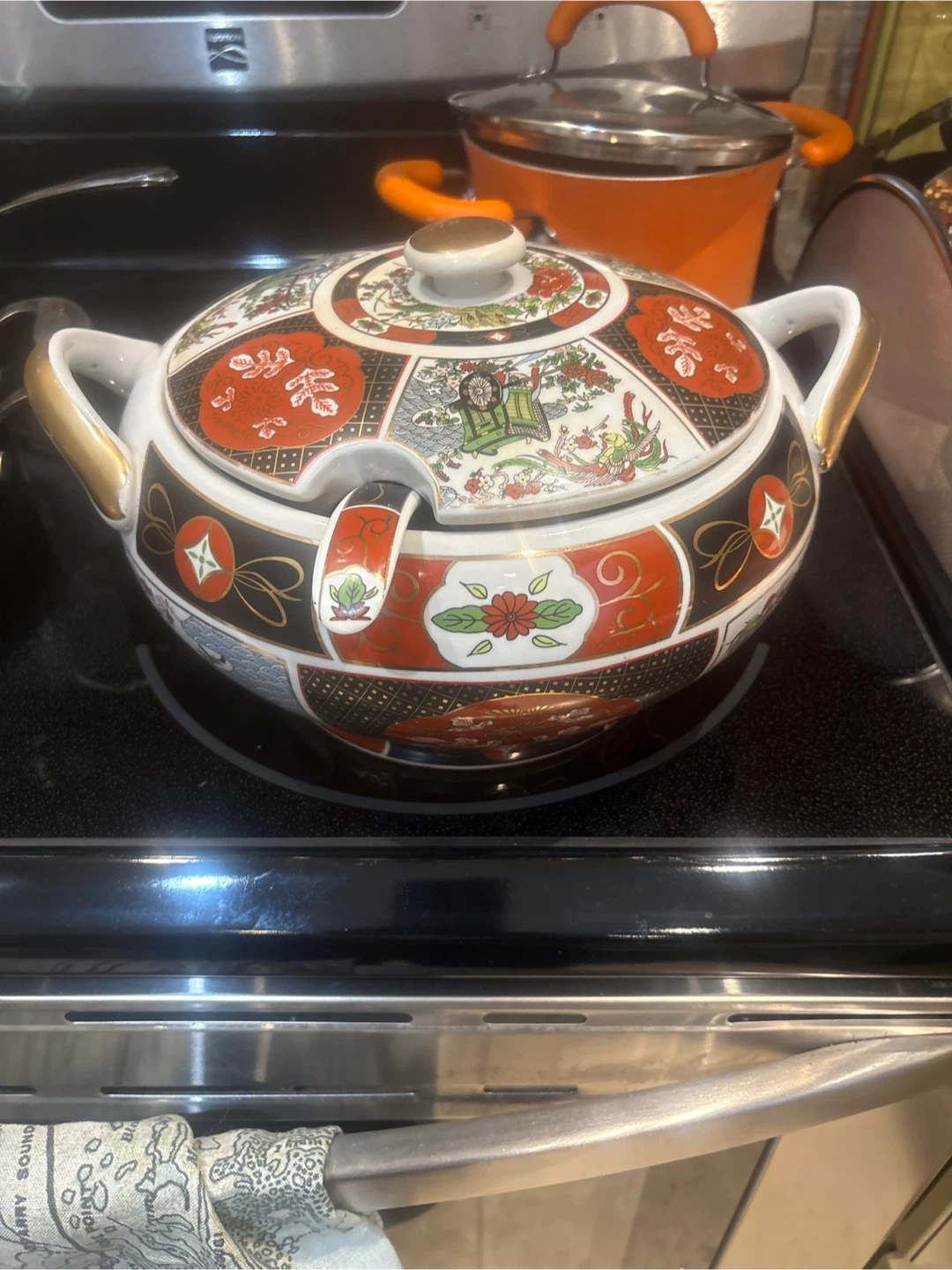 This is a vintage Imari design ceramic tureen with a matching ladle. It features a colourful floral and scenic pattern. The tureen has two handles and a lid with a small knob. Approx 45 years old