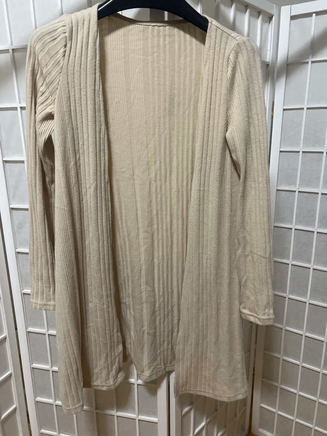 A long-sleeved beige cardigan with a ribbed knit texture. It's a lightweight layering piece. Measures approximately 28 inches in length.