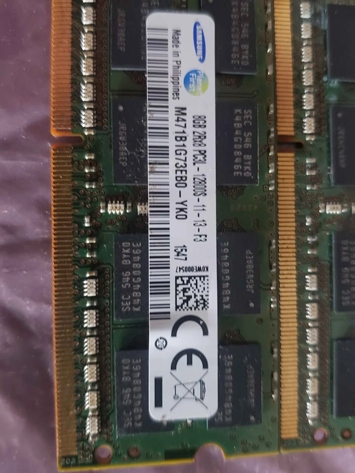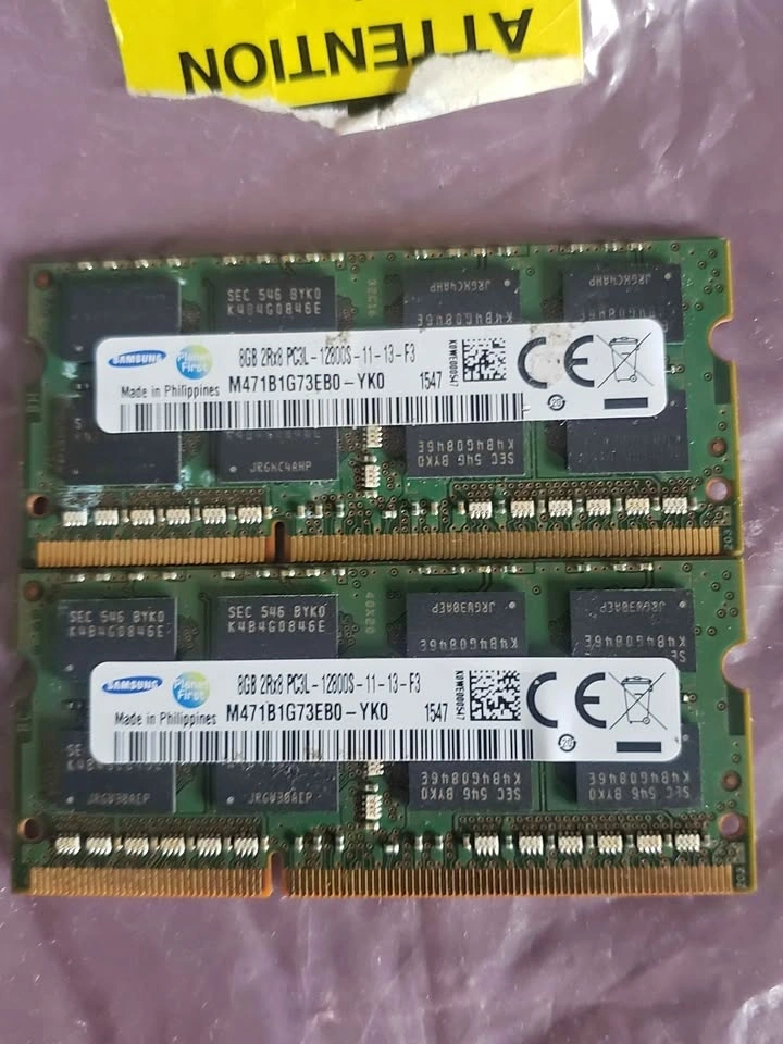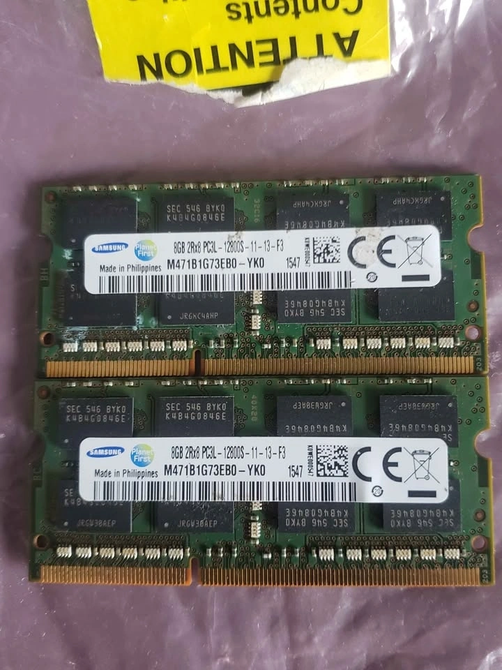 Reliable Samsung laptop memory kit includes two 8GB sticks for a total of 16GB. These are PC3L-12800S DDR3L modules with a 1600MHz speed. Green PCB with black memory chips and original labels intact. Great for upgrading older laptops that use SODIMM slots. Pickup in Dartmouth.