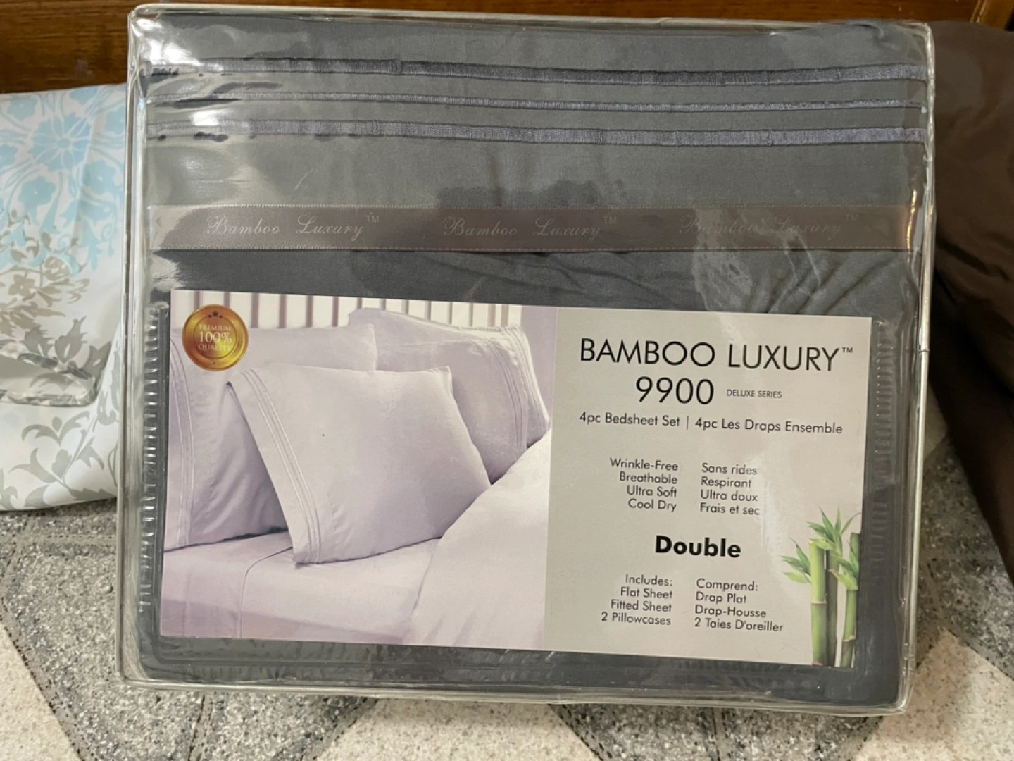 Get a great night's sleep with this Bamboo Luxury 9900 deluxe series bedsheet set! This set includes a flat sheet, fitted sheet, and two pillowcases. It's wrinkle-free, breathable, ultra-soft, and cool and dry. The size is Double.