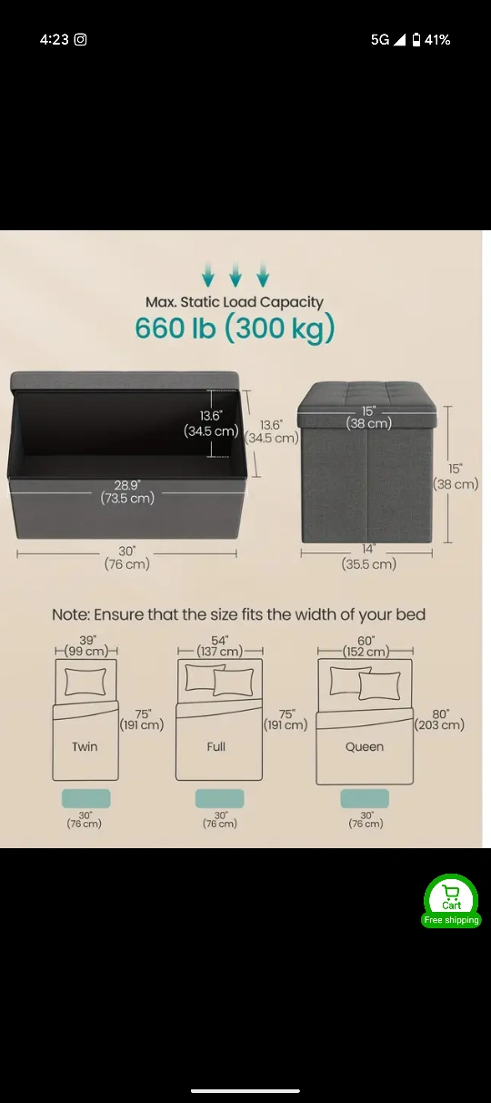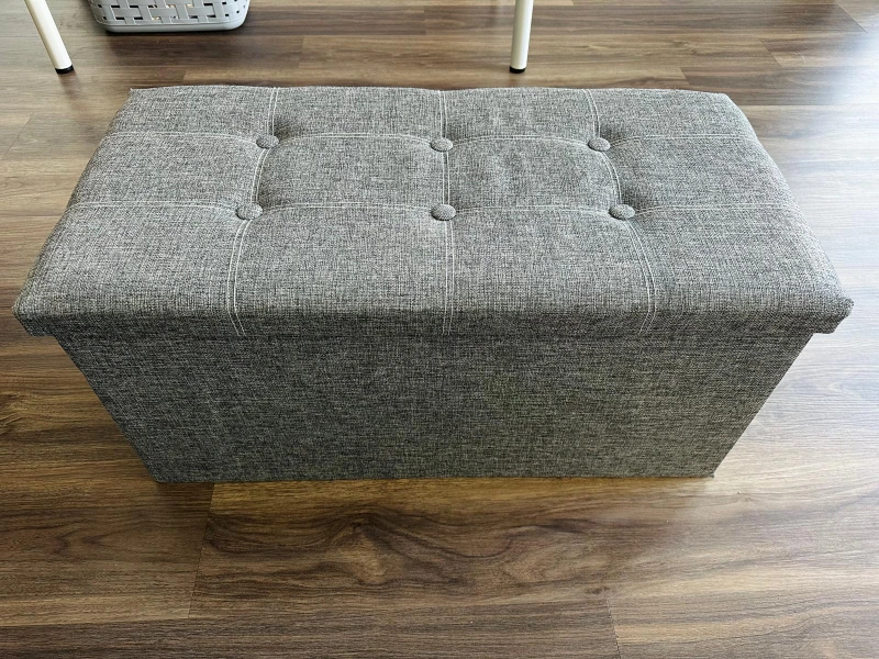 This grey storage ottoman bench is perfect for adding extra seating and storage to any room! It has a max static load capacity of 660 lb (300 kg). The dimensions are 13.6" (34.5 cm) in height, 28.9" (73.5 cm) in length, and 15" (38 cm) in width.