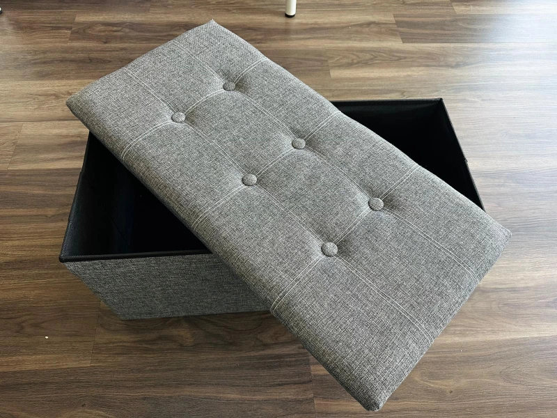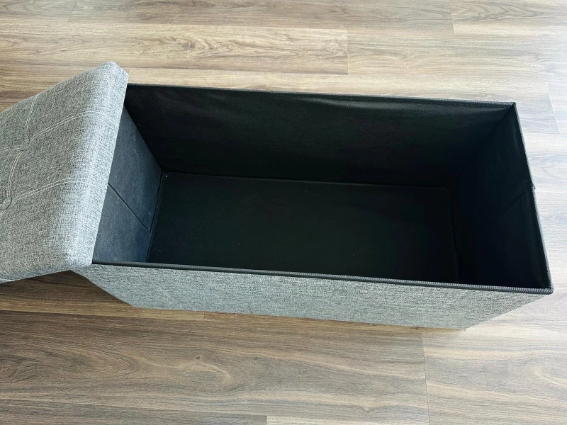 This grey storage ottoman bench is perfect for adding extra seating and storage to any room! It has a max static load capacity of 660 lb (300 kg). The dimensions are 13.6" (34.5 cm) in height, 28.9" (73.5 cm) in length, and 15" (38 cm) in width.