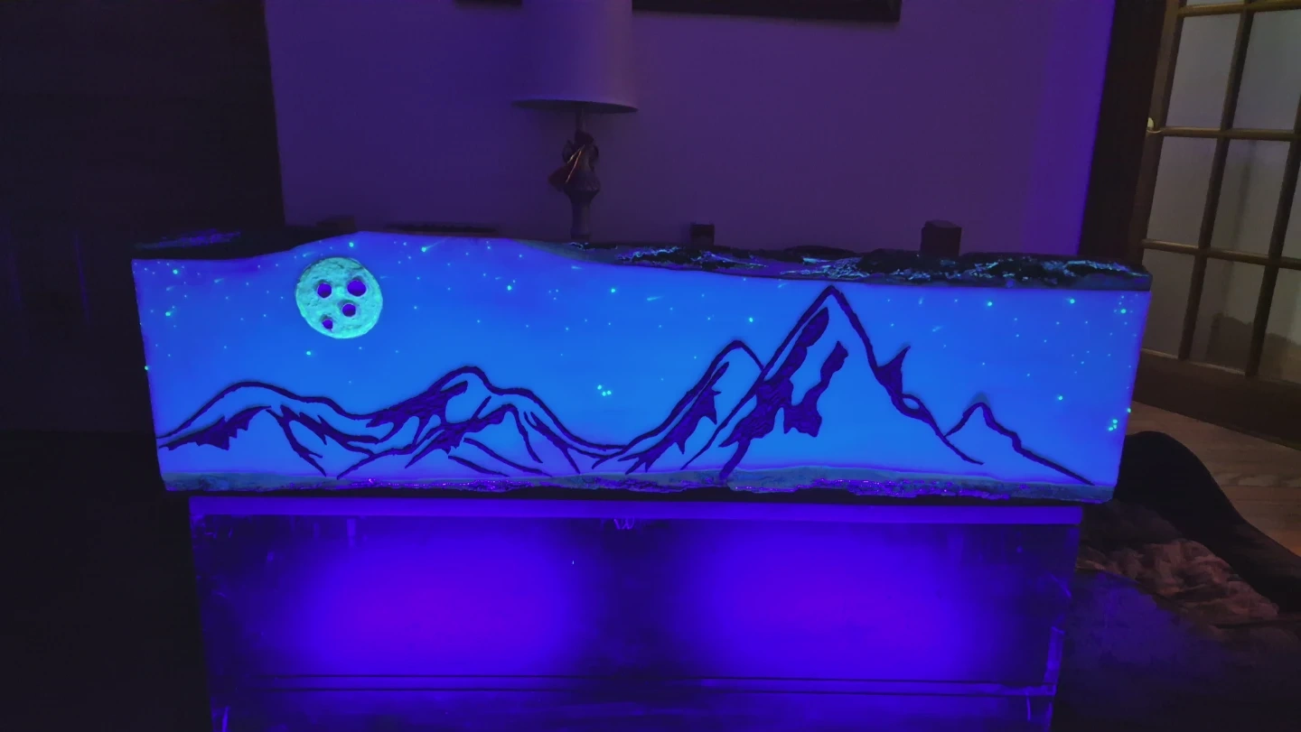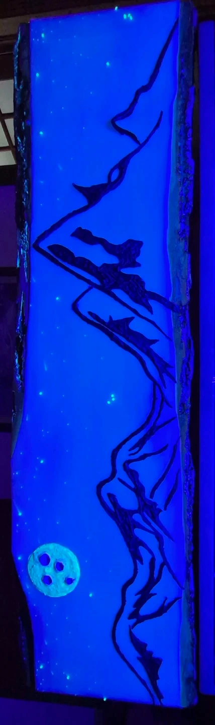 This handmade resin desk lamp features a stunning mountain range under a starry night sky, with a unique moon detail. It's illuminated by a bright blue light, creating a captivating ambiance. It's perfect for adding a touch of art and wonder to any room! ...