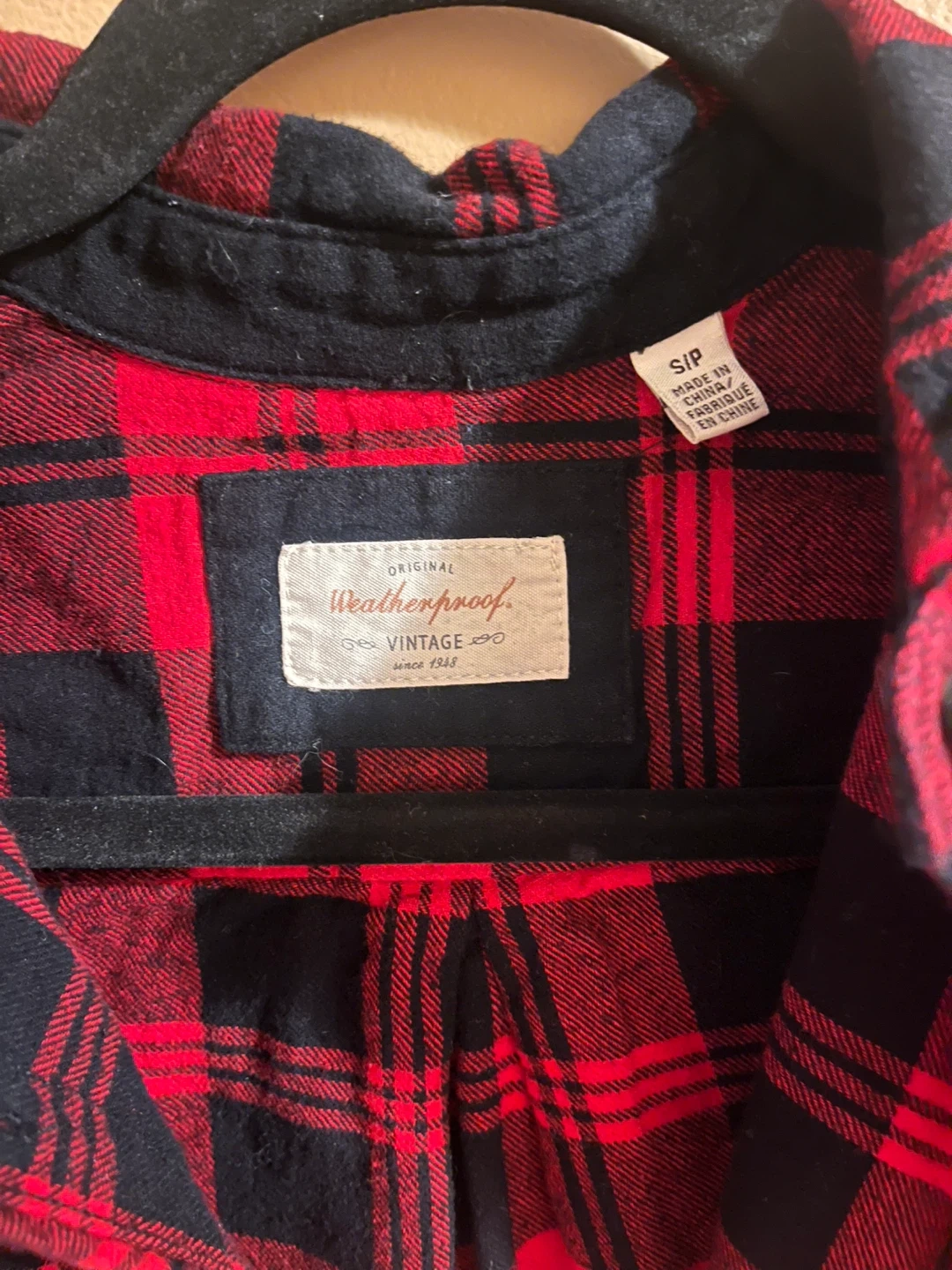 Original Weatherproof Vintage flannel shirt in red and black plaid. Size small. This shirt is great for casual wear.