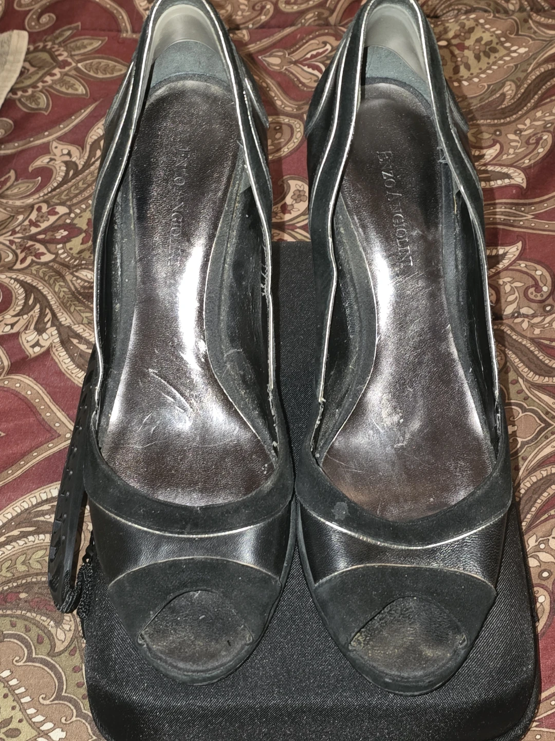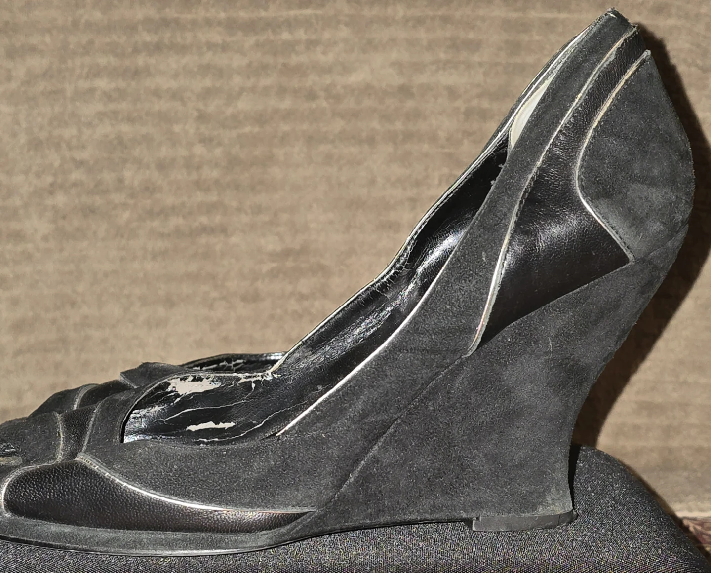 These black wedge heels are made from suede and faux leather accents. They feature an open-toe design with a peep toe. Perfect for dressing up an outfit!
