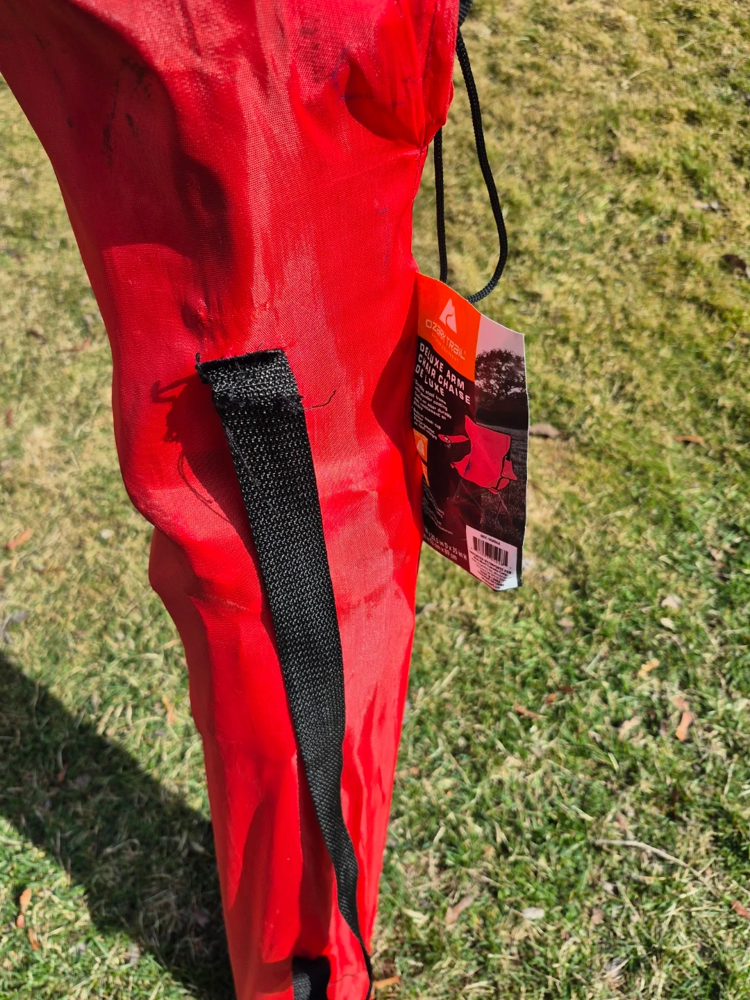 This Ozark Trail Deluxe Arm Chair is red and includes a cup holder. It folds up for easy transport and storage. Fabric material.