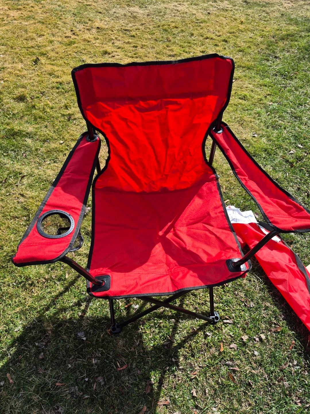 This Ozark Trail Deluxe Arm Chair is red and includes a cup holder. It folds up for easy transport and storage. Fabric material.