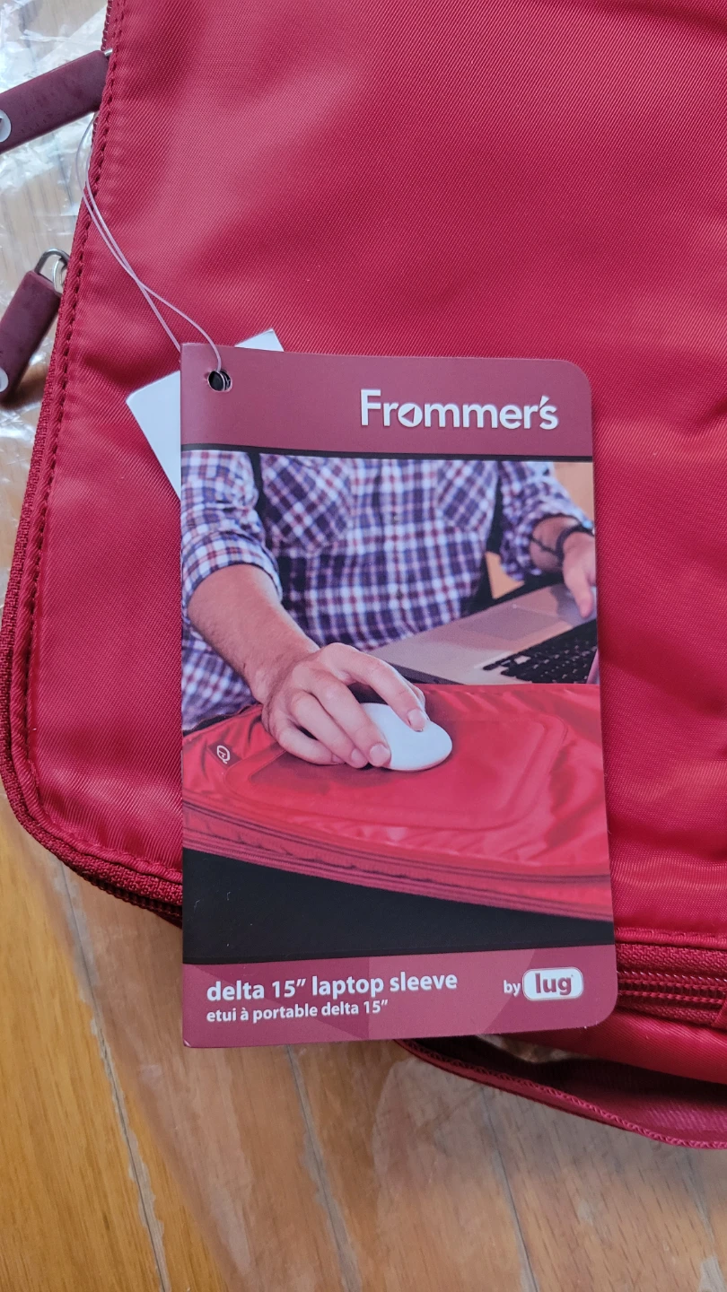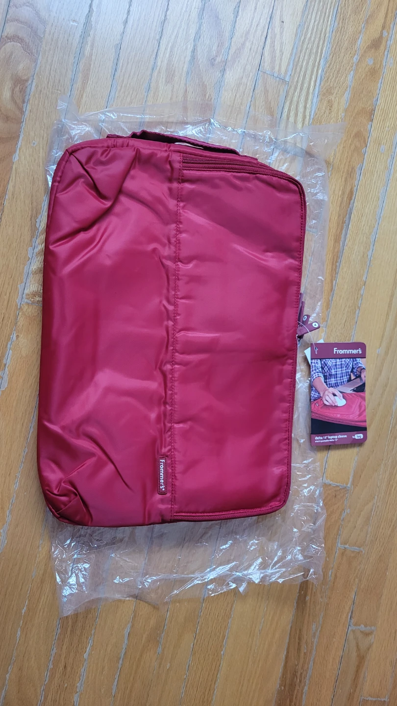 This Lug Frommer's Delta laptop sleeve fits up to a 15" device. It's red with a zippered closure. It's perfect for keeping your laptop protected on the go! Brand new, never been used. With the original tag.