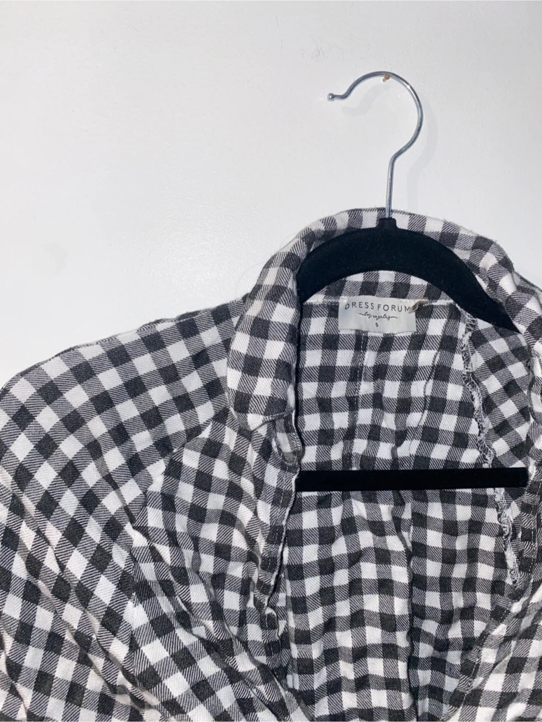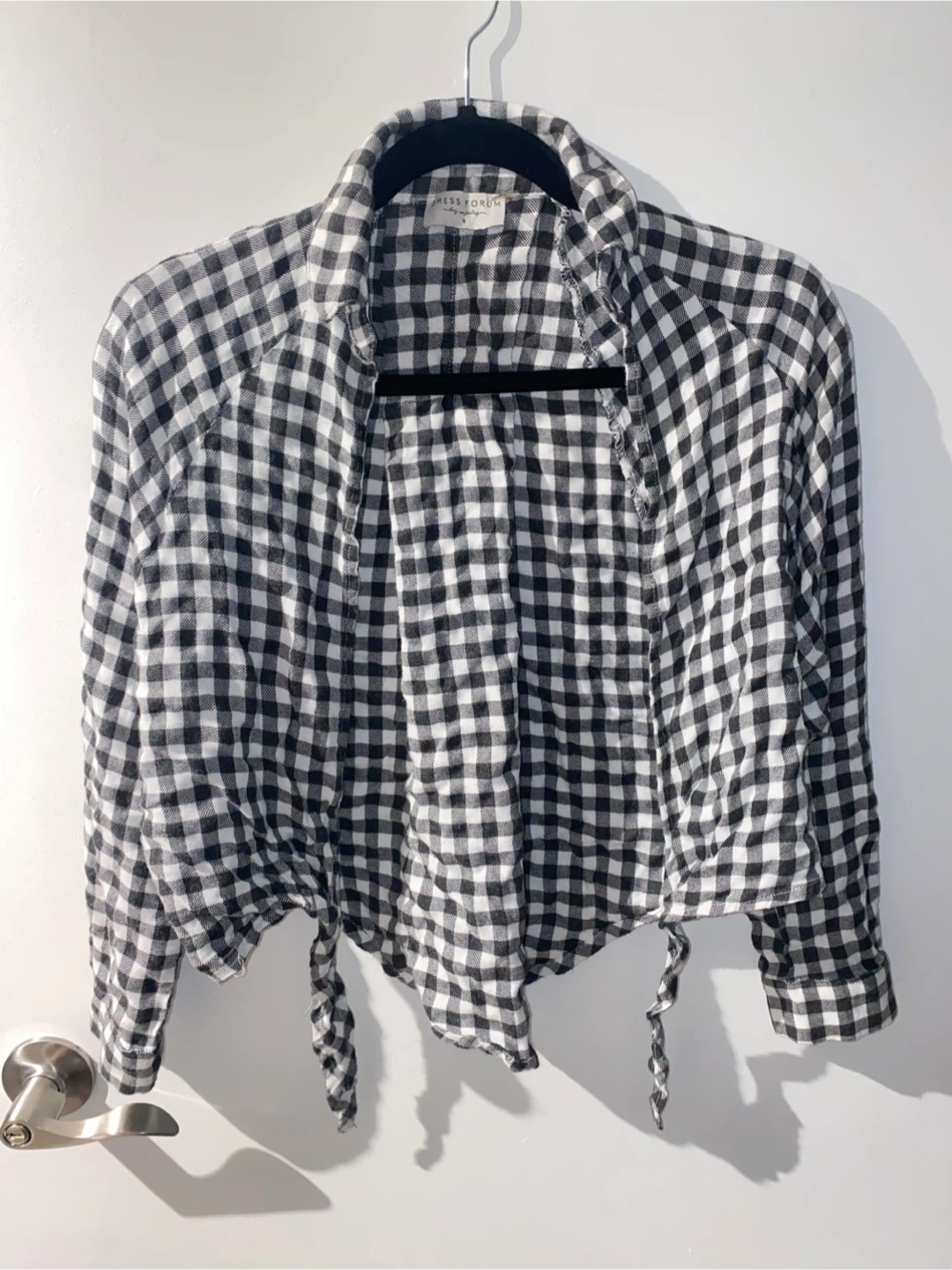 Black and white gingham pattern button-up shirt. It has long sleeves and a tie-front detail. Size is medium.