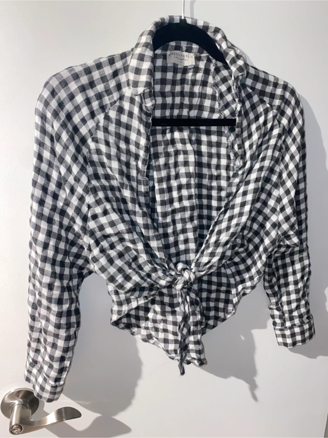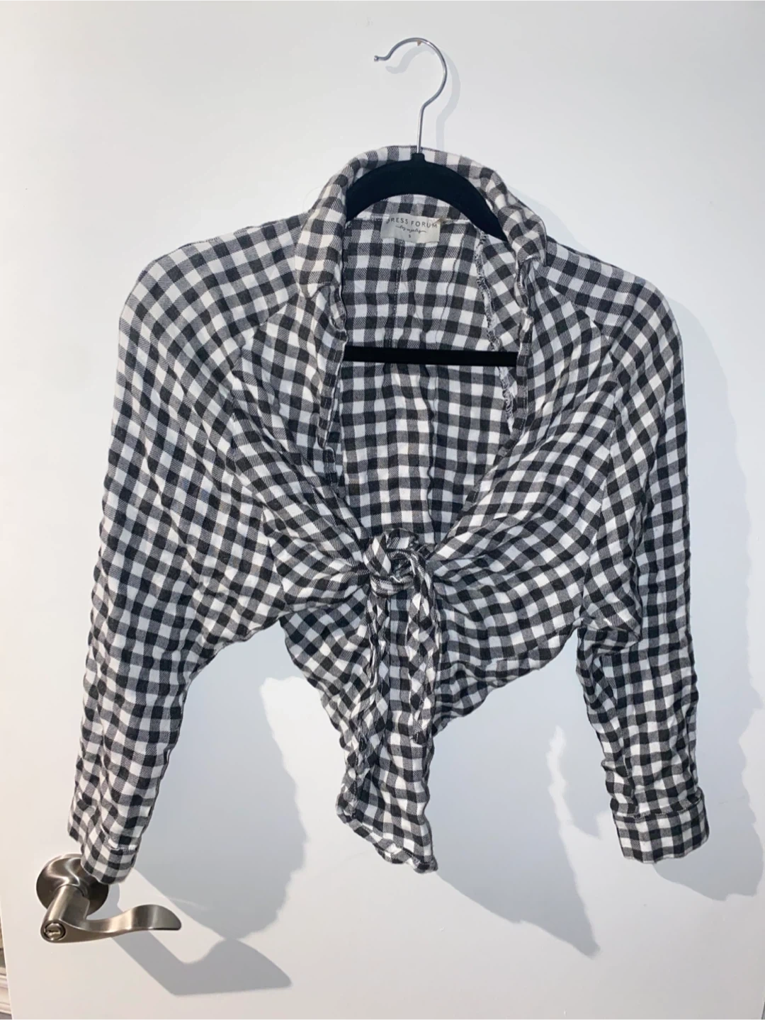 Black and white gingham pattern button-up shirt. It has long sleeves and a tie-front detail. Size is medium.