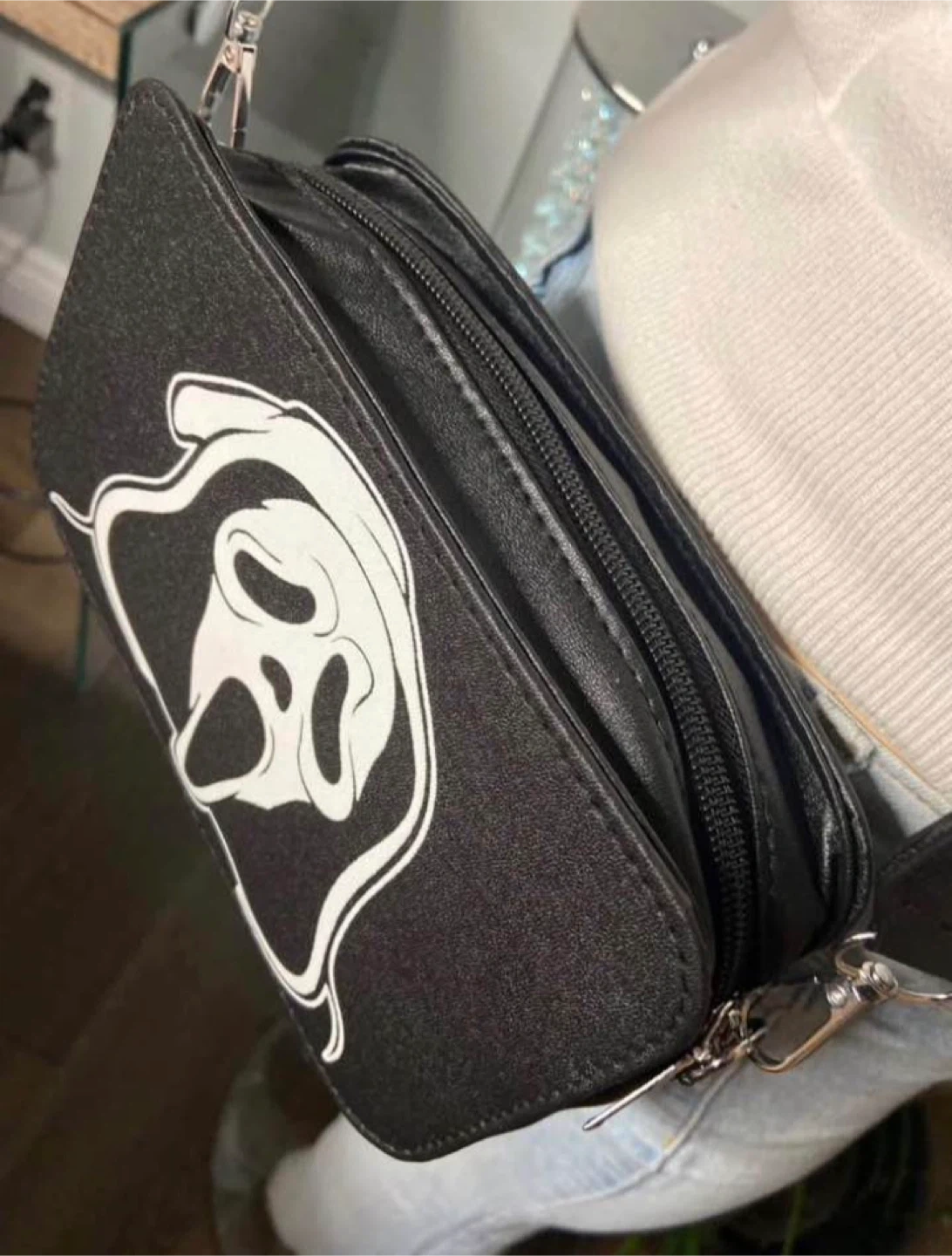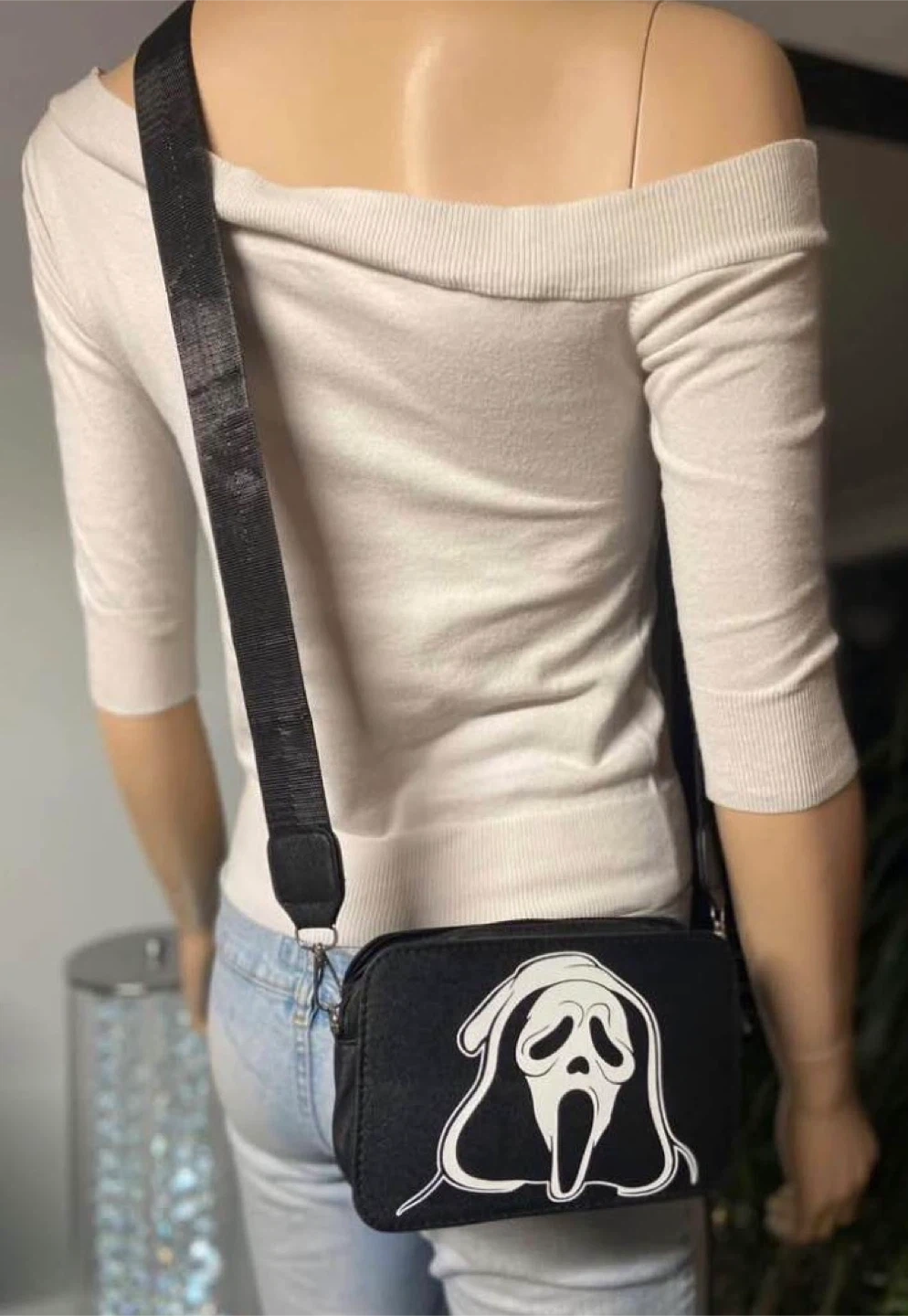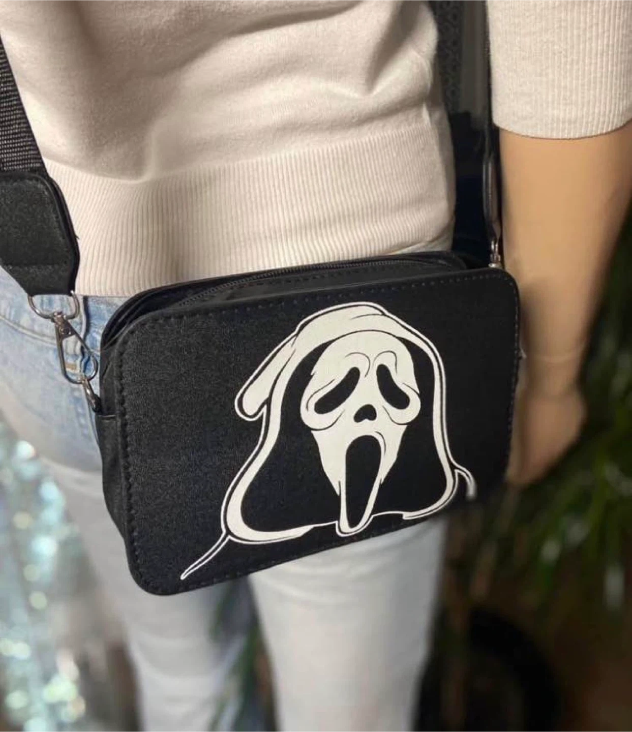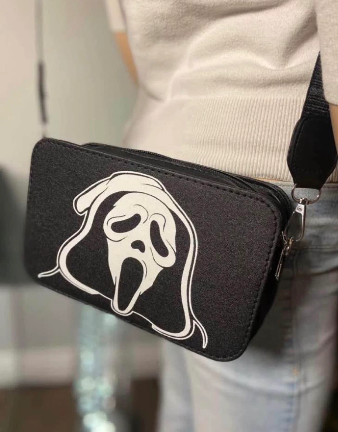 Black crossbody bag featuring the iconic Ghostface mask design from Scream horror movie franchise