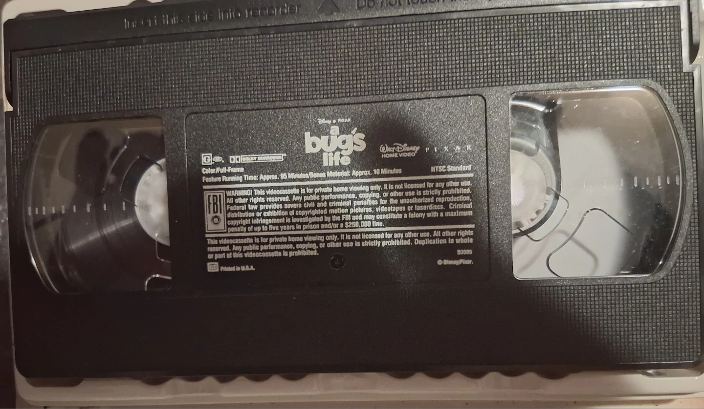 Disney Pixar's A Bug's Life on VHS. Full-frame color. Feature running time is approximately 95 minutes with about 10 minutes of bonus material. This is an NTSC standard tape. Pickup only unless near intersection of Oxford and Gammage Street.