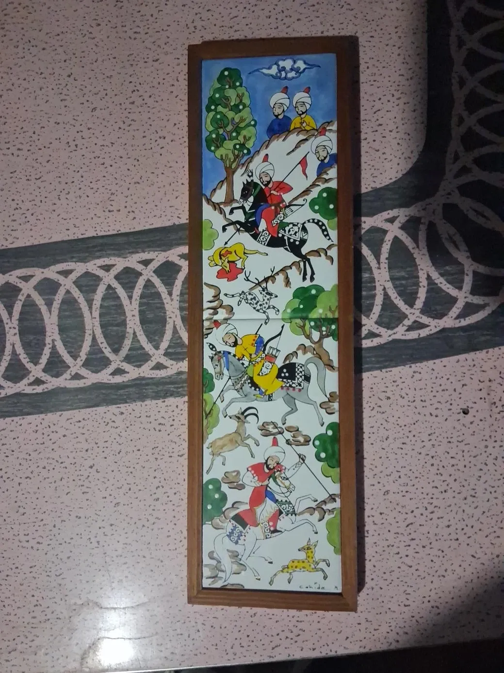 This is a vintage Ottoman miniature painting in a wooden frame. It depicts a hunting scene with figures on horseback. The painting is colorful and detailed.