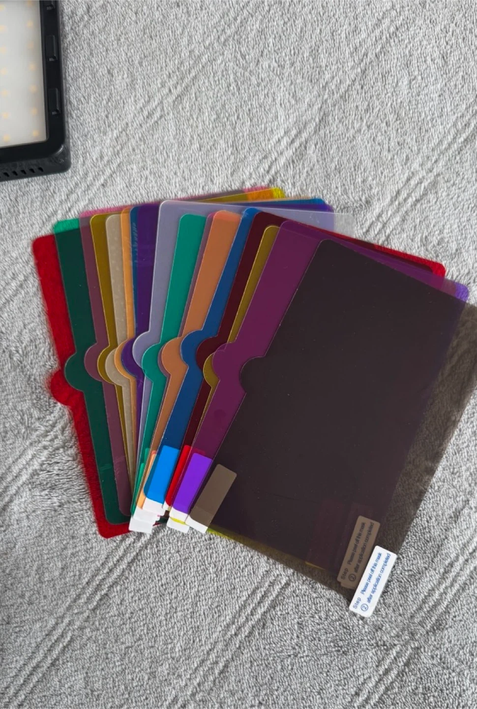 LED panel light with adjustable tripod stand and USB power cable with inline controls. Includes multiple color filters.