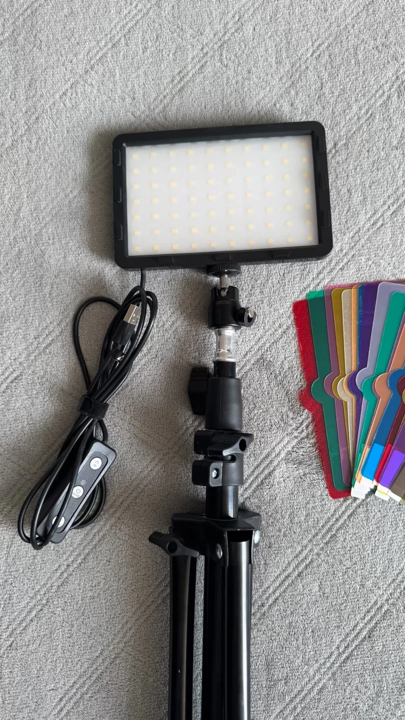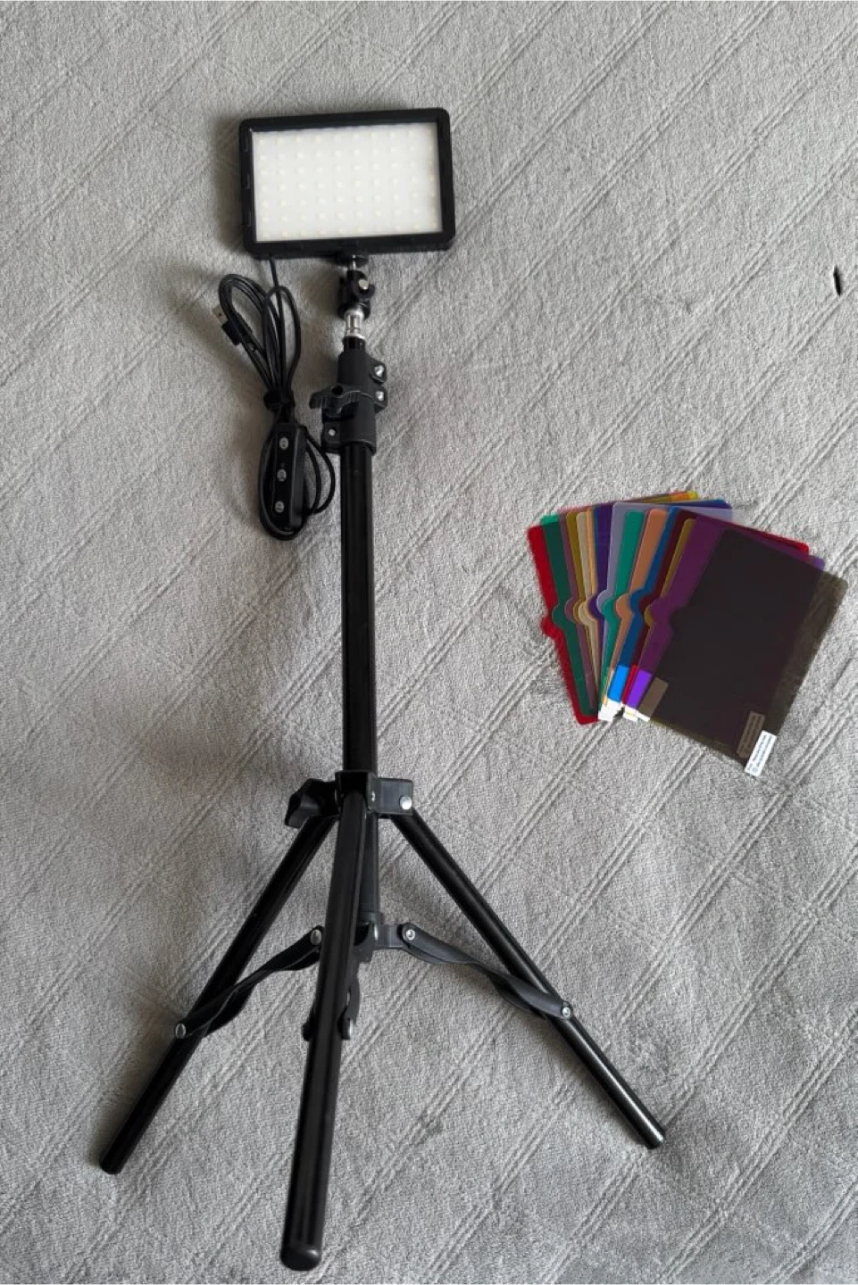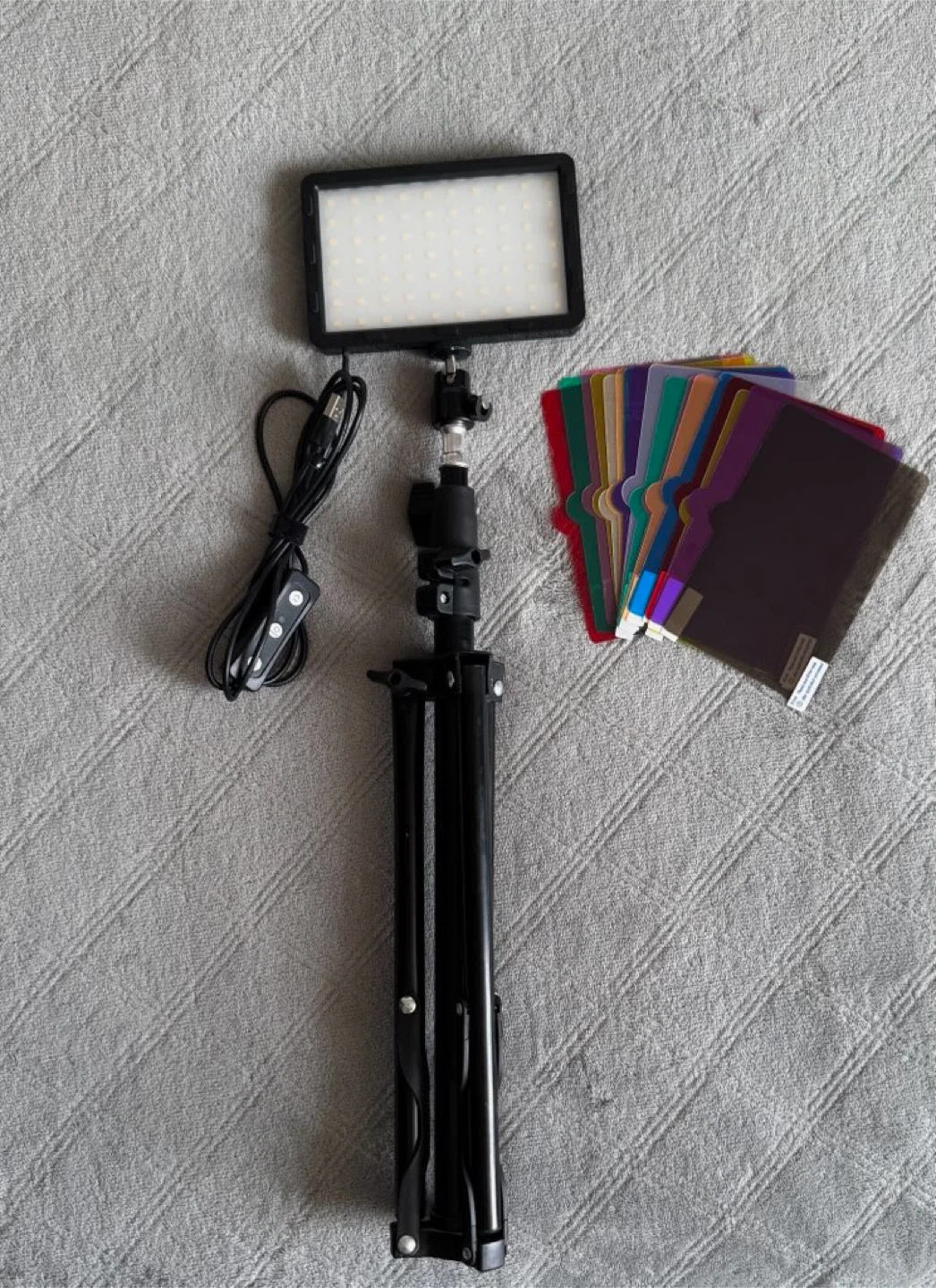 LED panel light with adjustable tripod stand and USB power cable with inline controls. Includes multiple color filters.