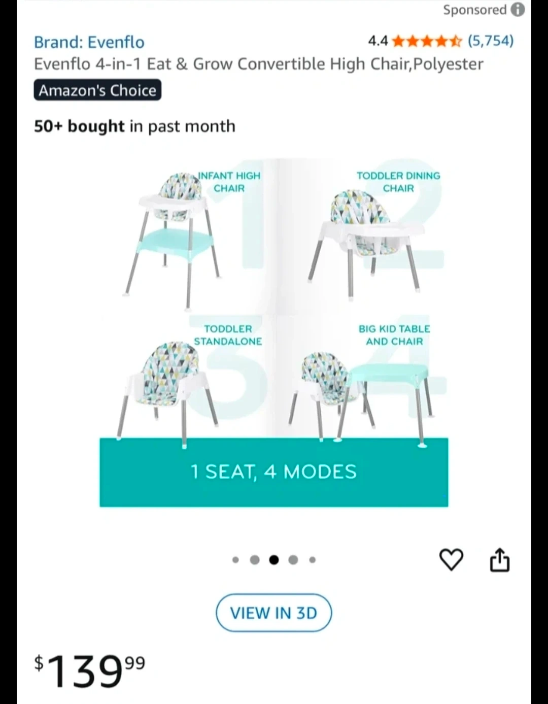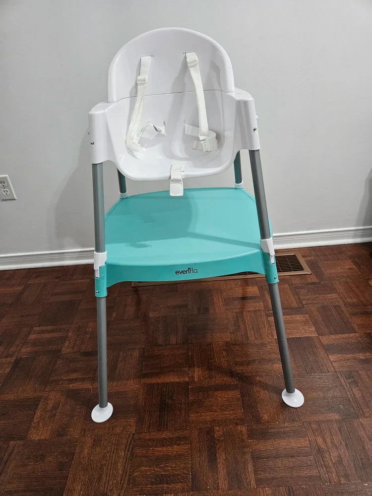 Selling a gently used Evenflo 4-in-1 High Chair in great condition! It features a white seat with a teal base and grey legs. Perfect for your little one's mealtime adventures. It comes with a patterned seat cover as well!