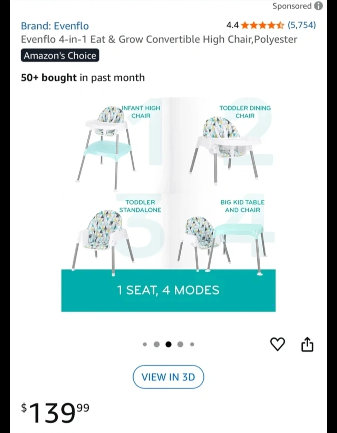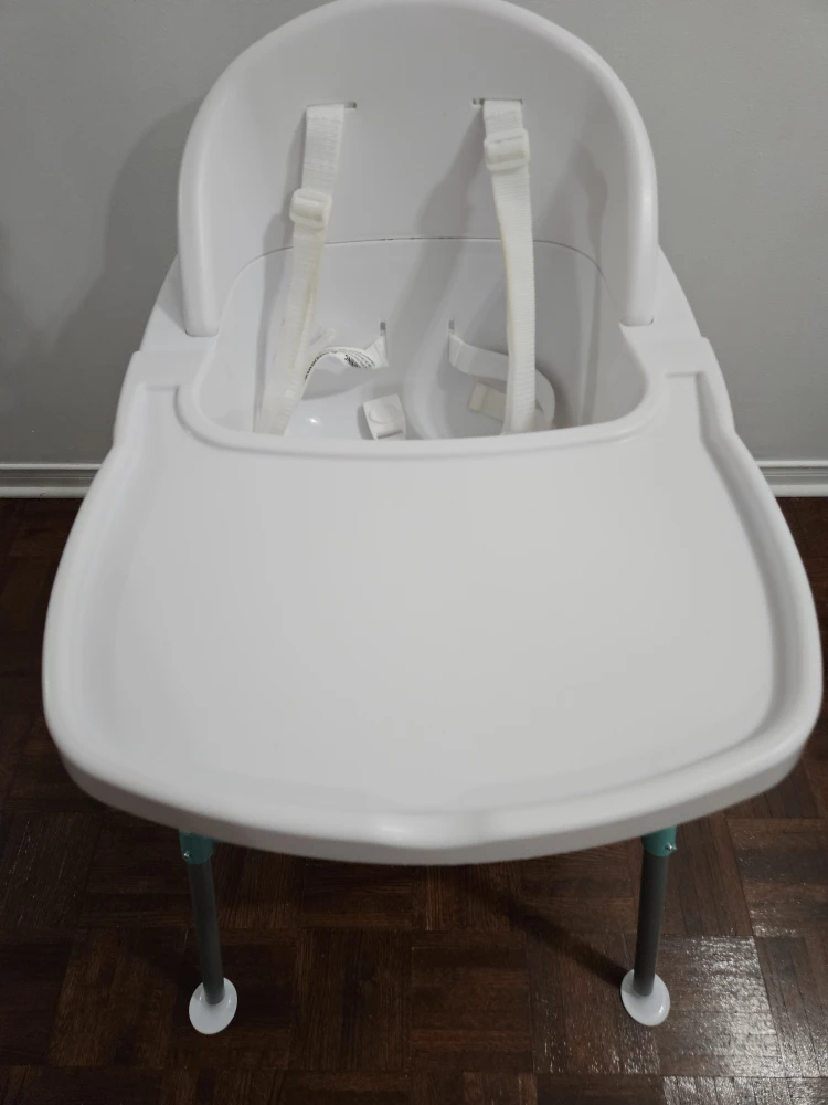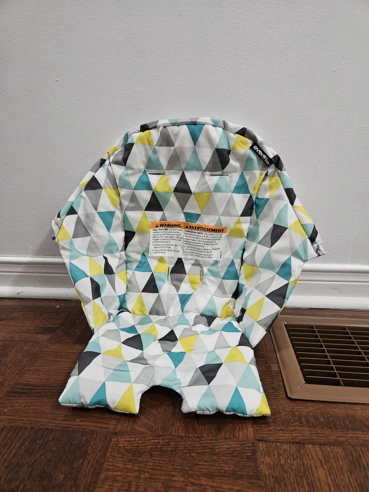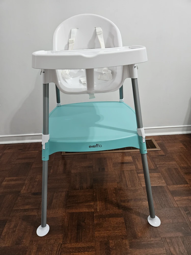 Selling a gently used Evenflo 4-in-1 High Chair in great condition! It features a white seat with a teal base and grey legs. Perfect for your little one's mealtime adventures. It comes with a patterned seat cover as well!