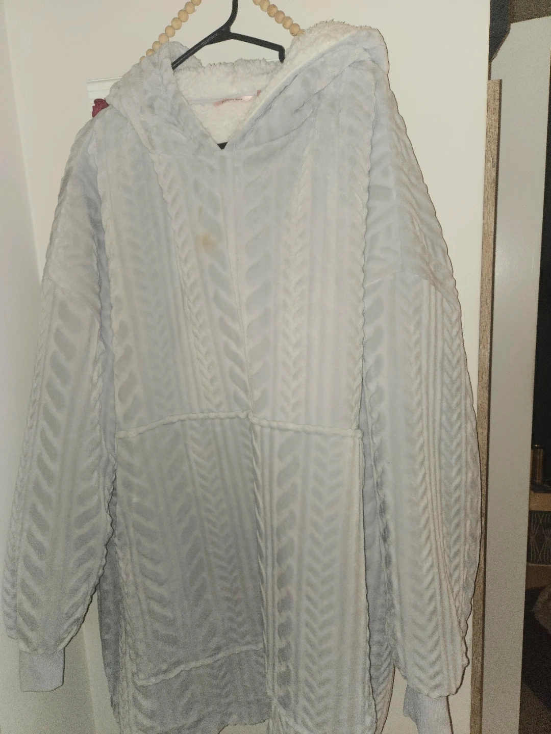 It's super soft and warm, perfect for lounging around the house. The cable knit exterior adds a stylish touch. One size fits most.