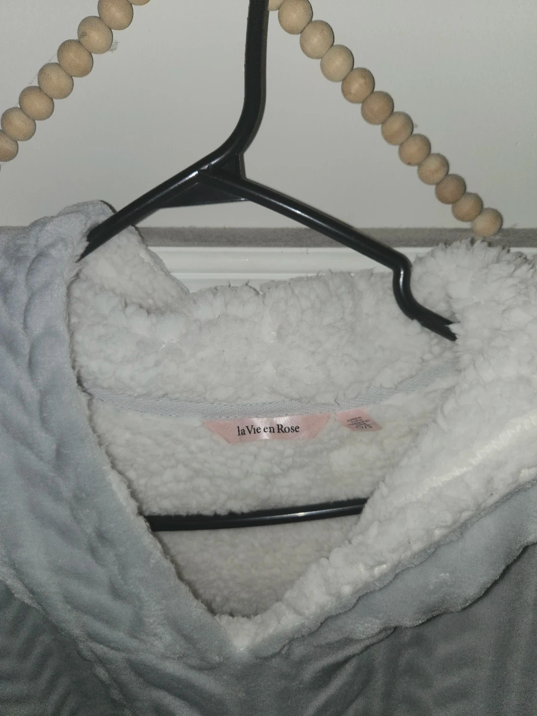 It's super soft and warm, perfect for lounging around the house. The cable knit exterior adds a stylish touch. One size fits most.