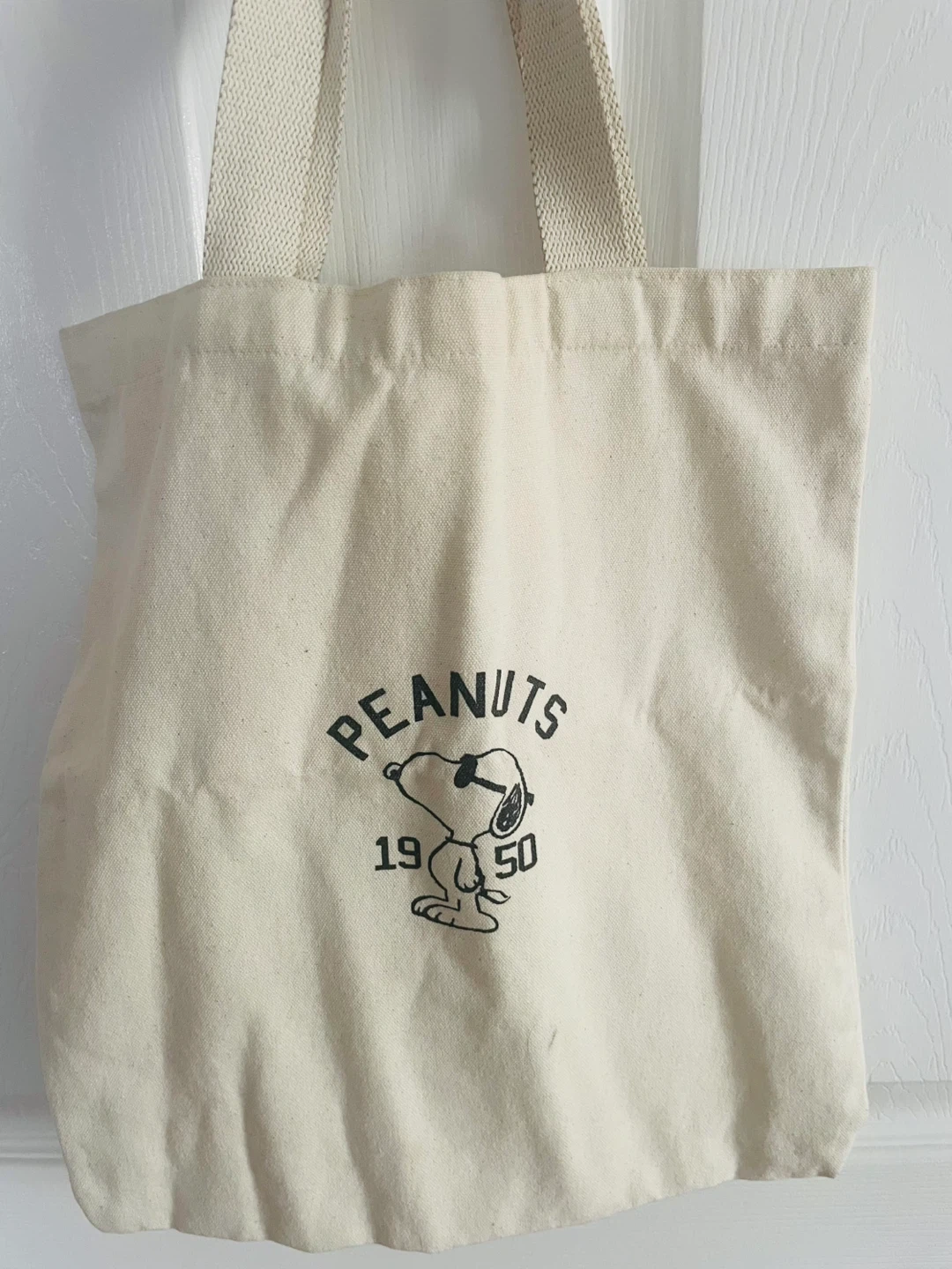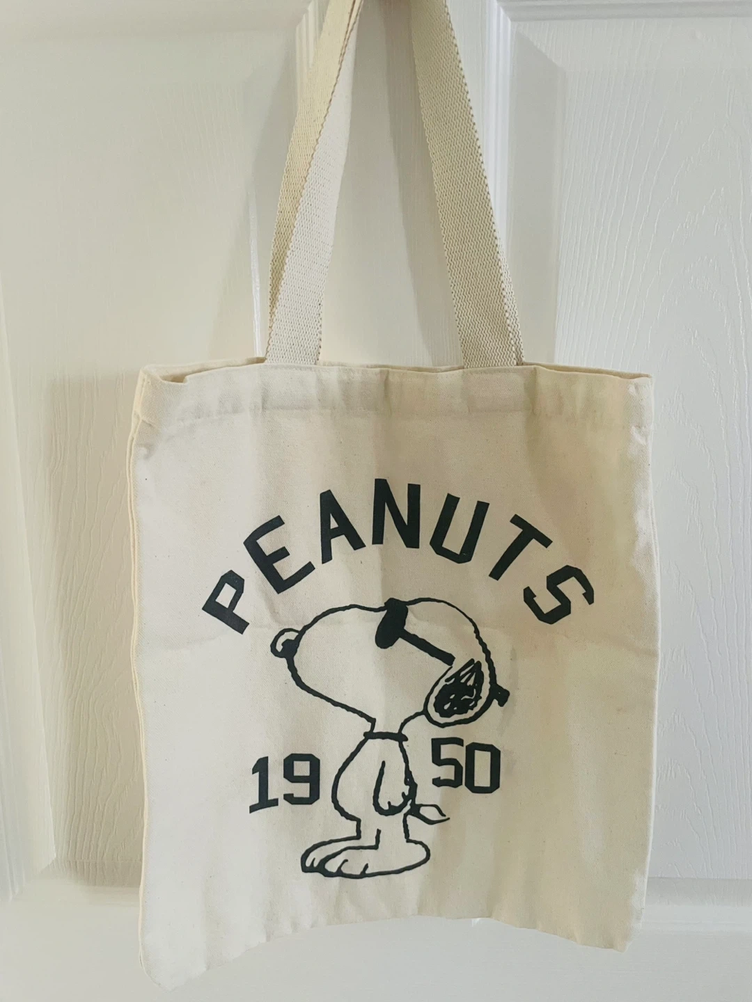 Canvas tote bag featuring Snoopy from Peanuts. The design shows Snoopy with sunglasses and the year '1950'. Fabric handles for carrying.