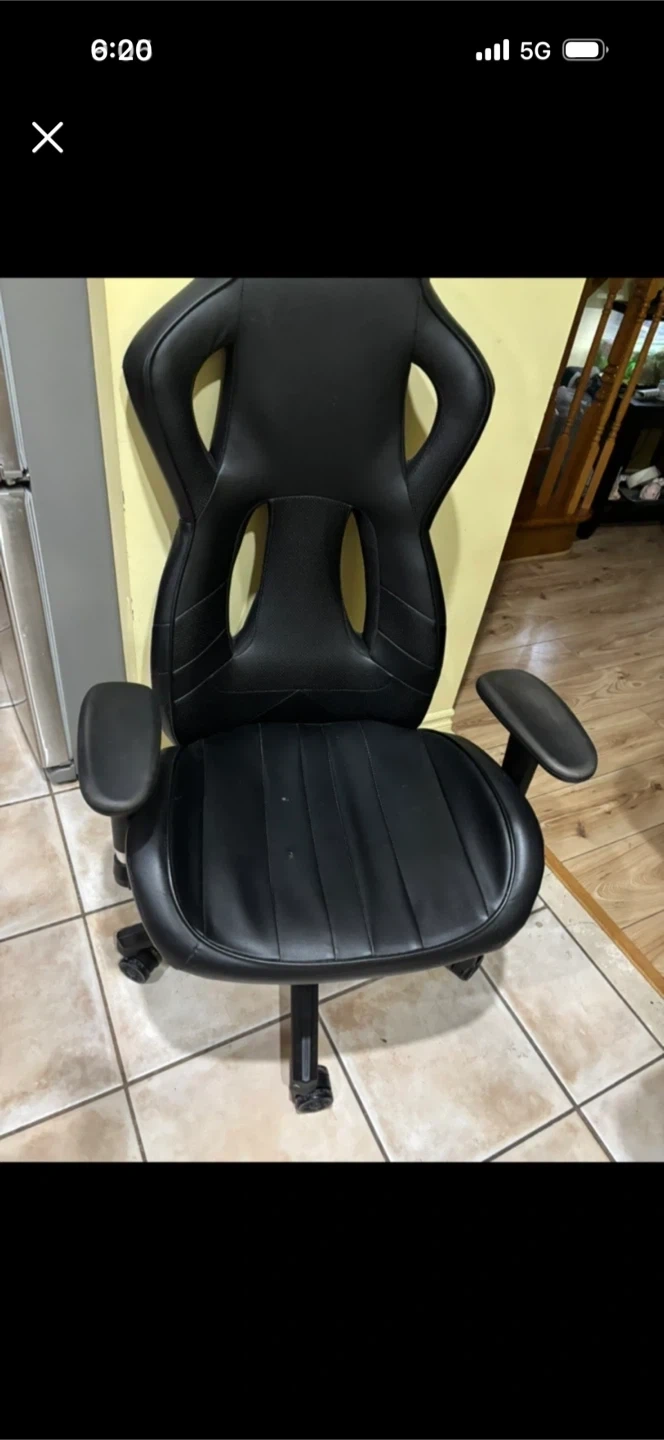 This is a black faux leather ergonomic office chair. It's designed for comfort and support during long sitting periods. The chair features adjustable height and armrests. Its sleek design makes it a great addition to any home office or gaming setup!