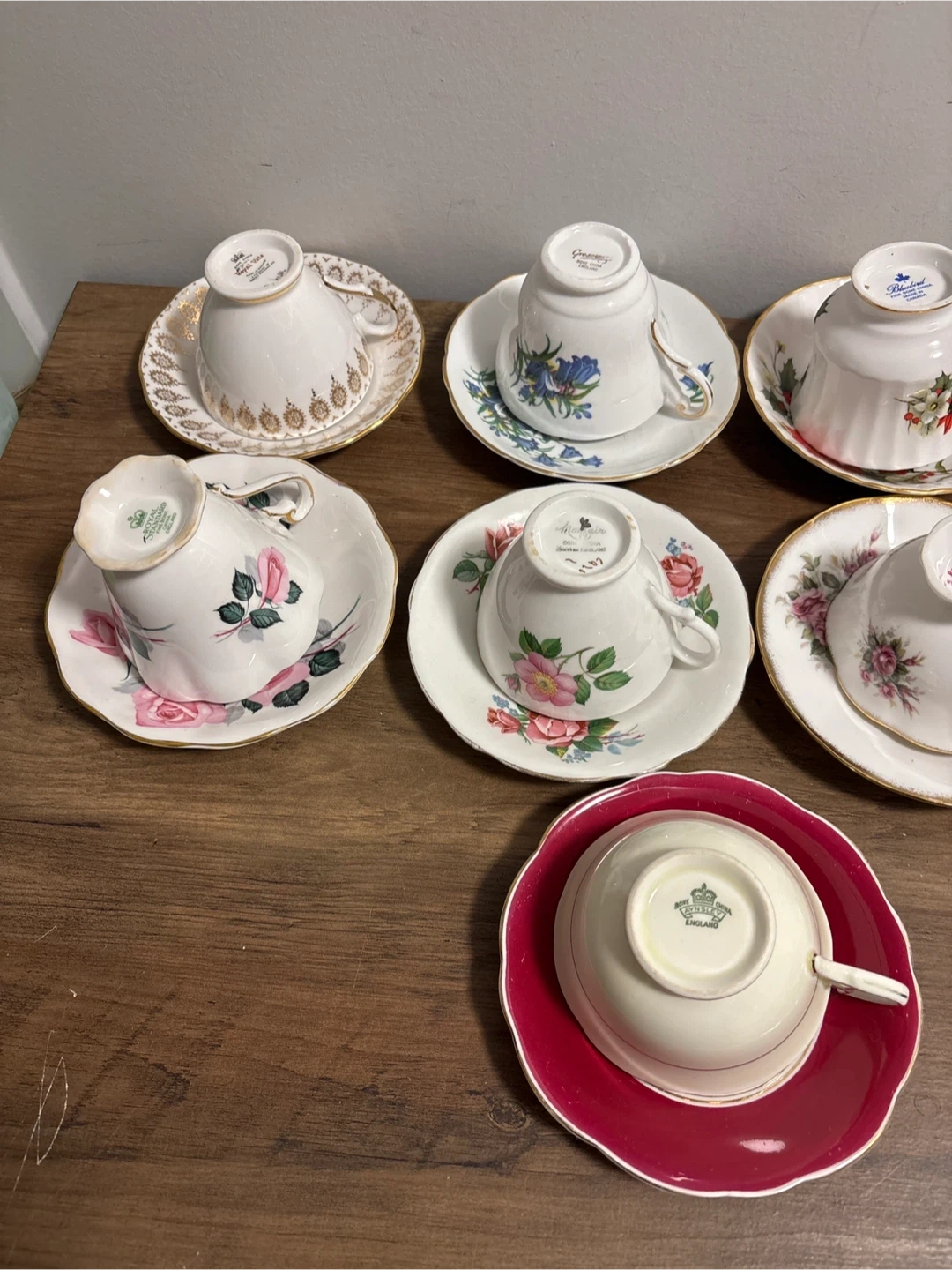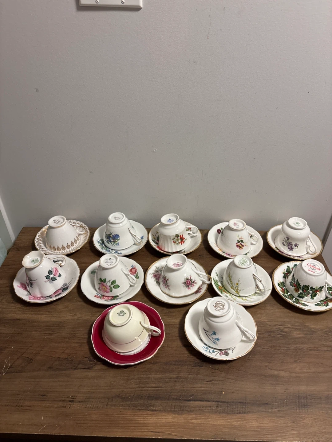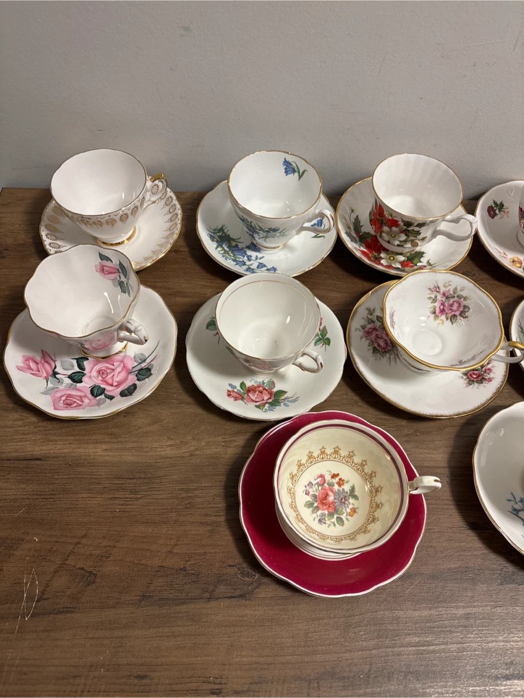 This is a collection of twelve assorted vintage teacups and saucers, featuring various floral designs. Each cup and saucer is made of fine china and England and one from Canada. They're great for adding a touch of elegance to your afternoon tea or for display!