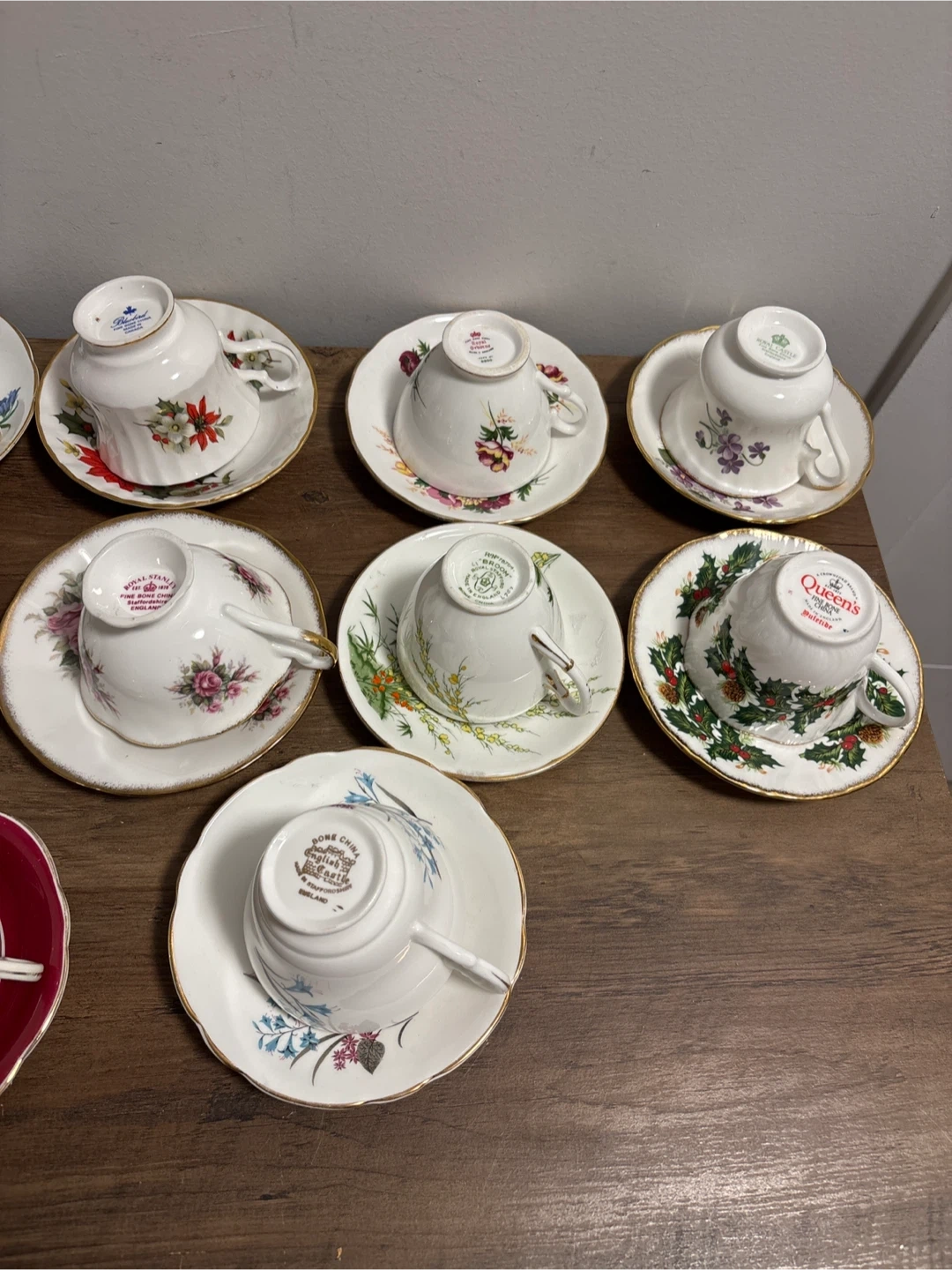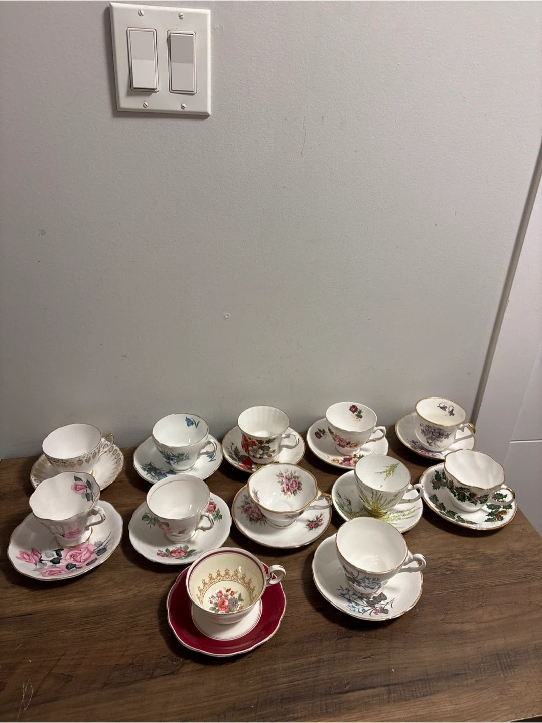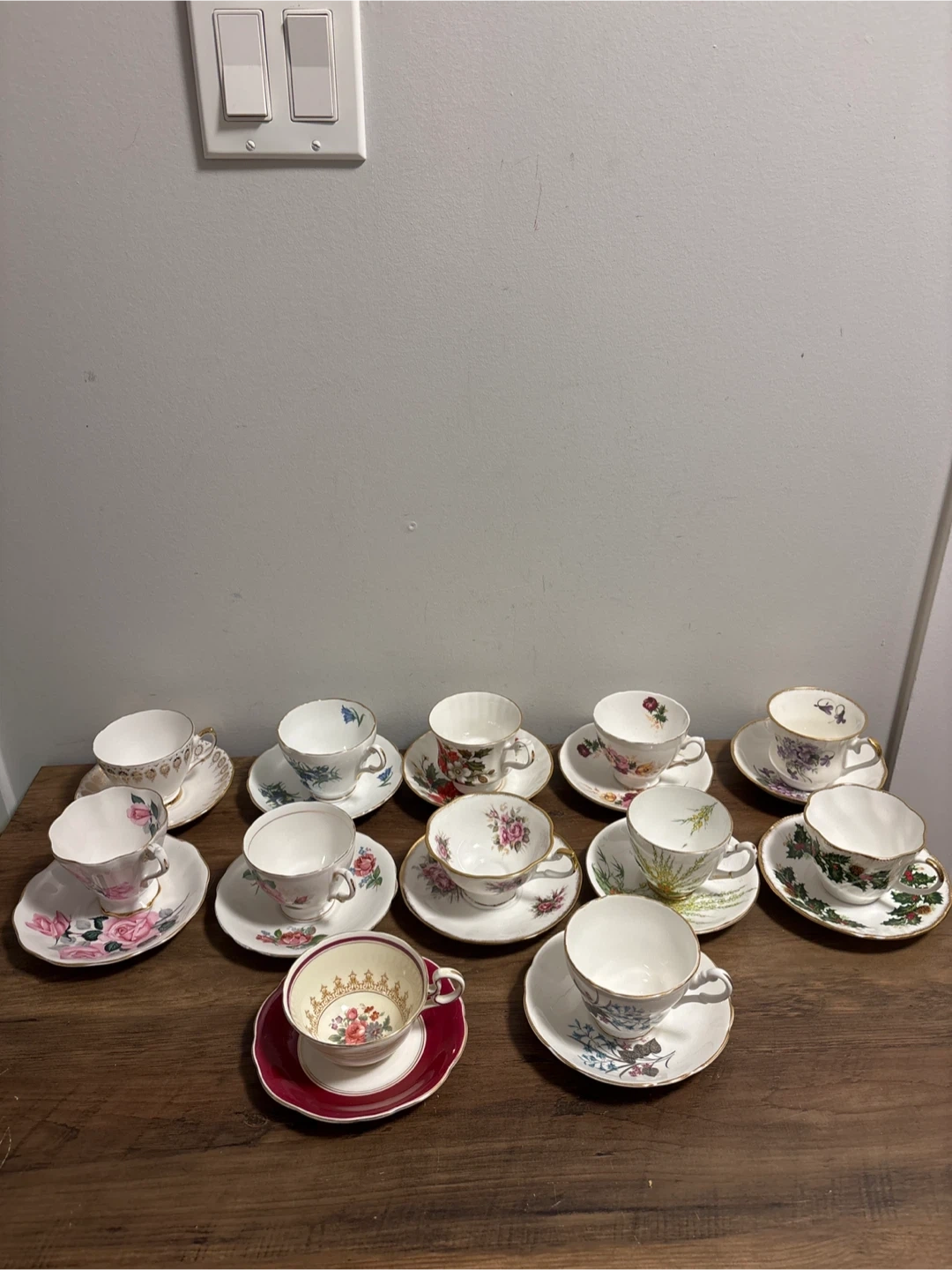 This is a collection of twelve assorted vintage teacups and saucers, featuring various floral designs. Each cup and saucer is made of fine china and England and one from Canada. They're great for adding a touch of elegance to your afternoon tea or for display!