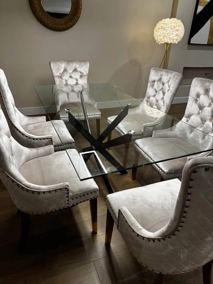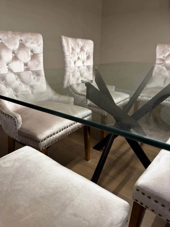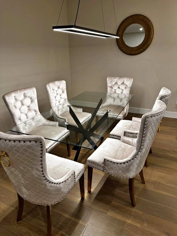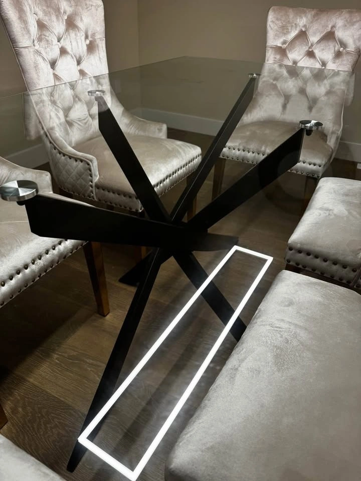 Elevate your dining space with this modern glass table featuring a high-gloss 9mm tempered top and strong metal criss-cross legs for a luxurious look.