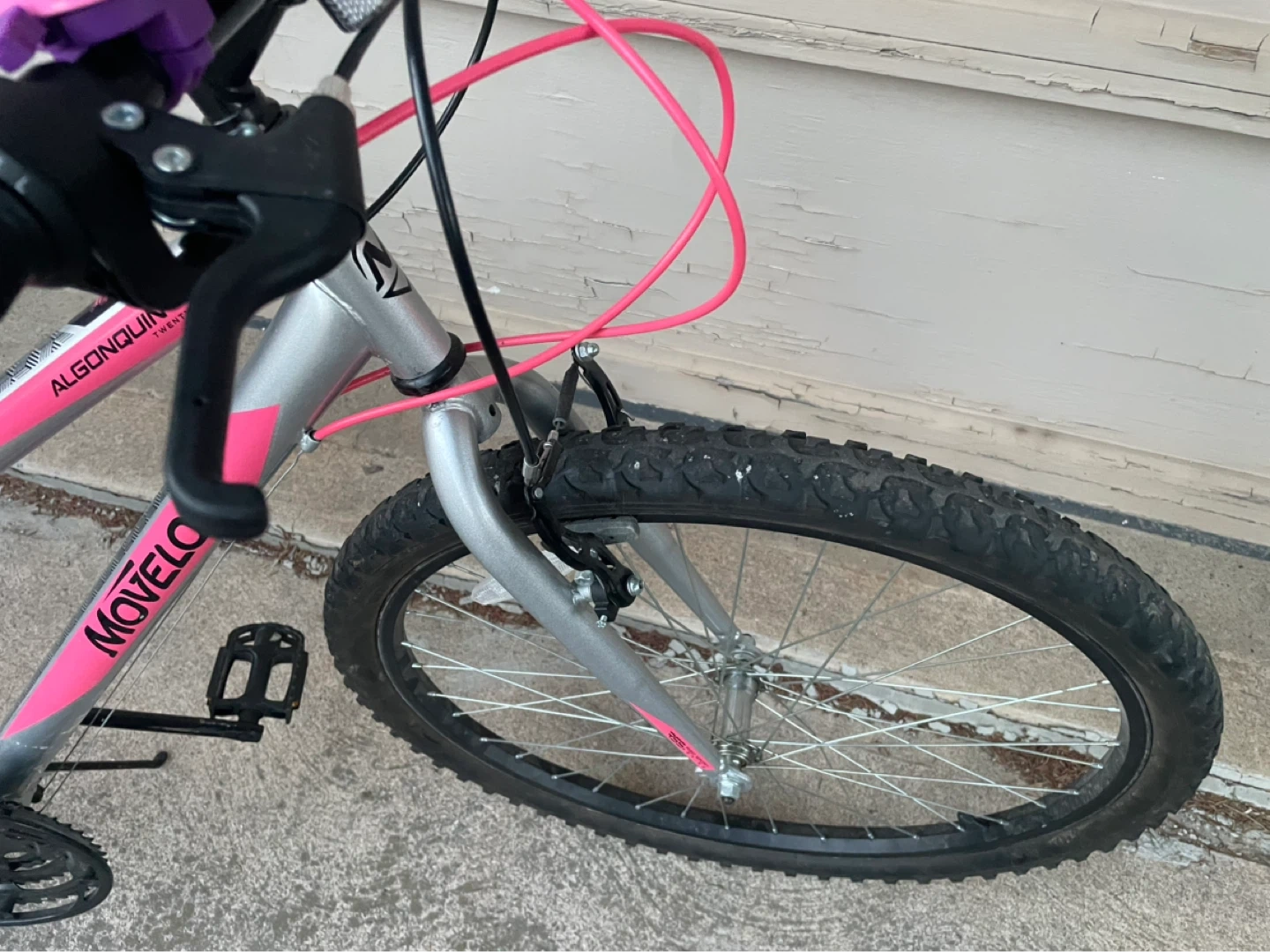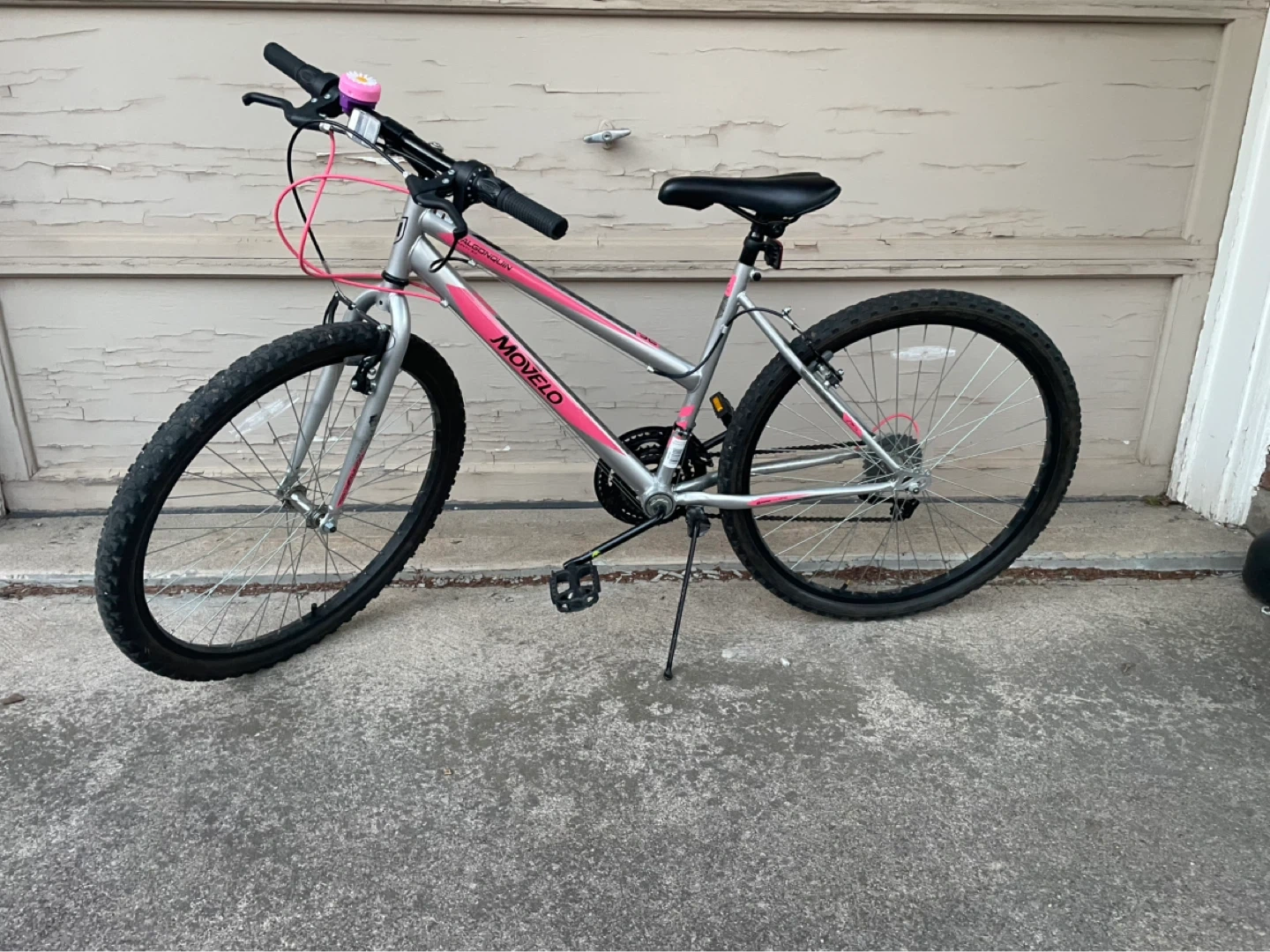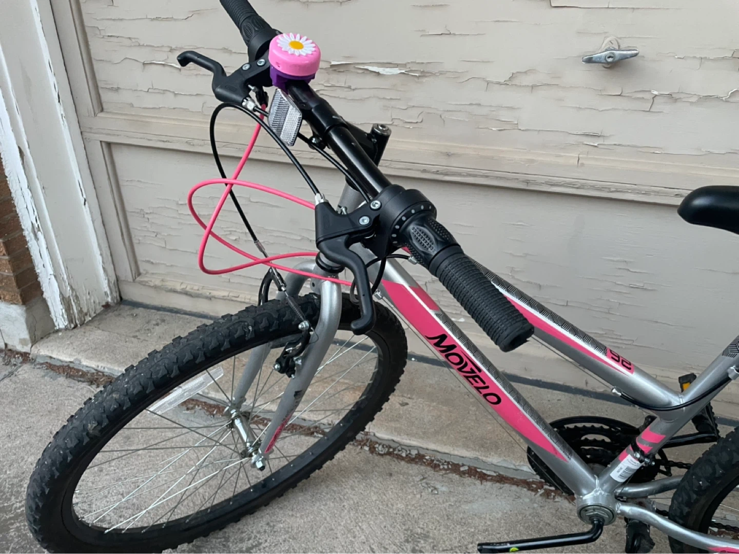 This is a Movel o kids mountain bike with a silver and pink frame. It's designed for easy riding on various terrains. Features hand brakes and a pink bell for fun!