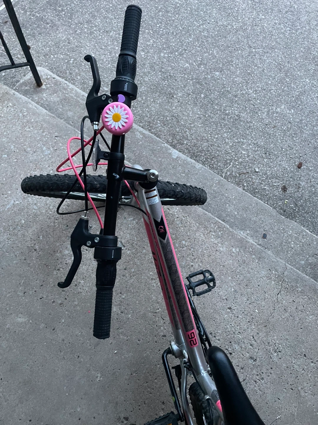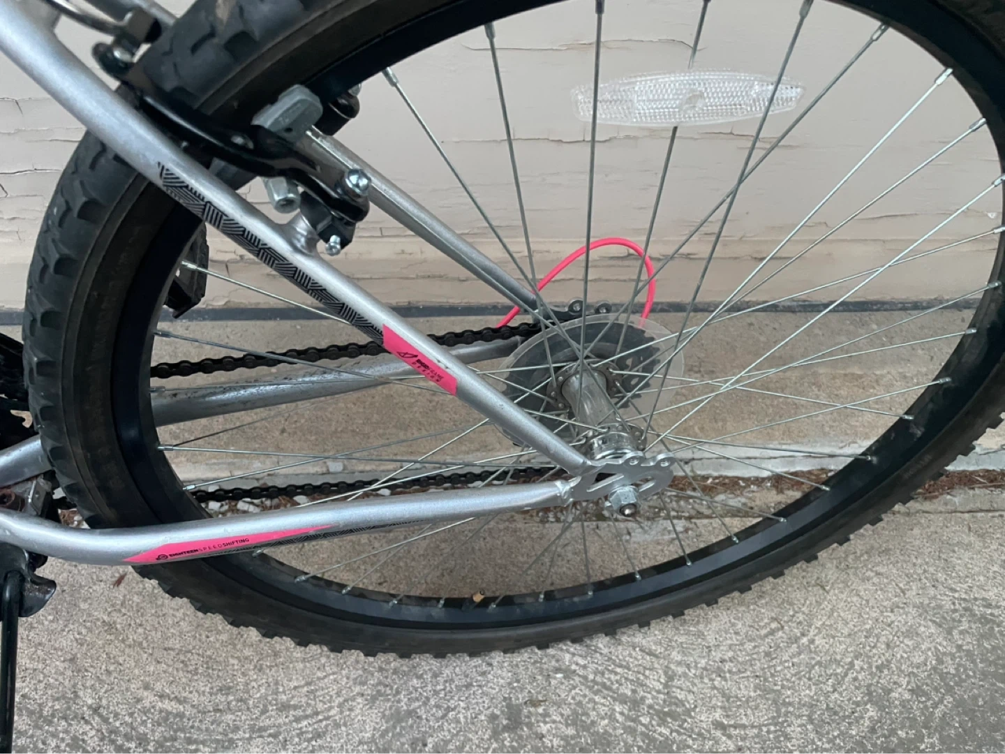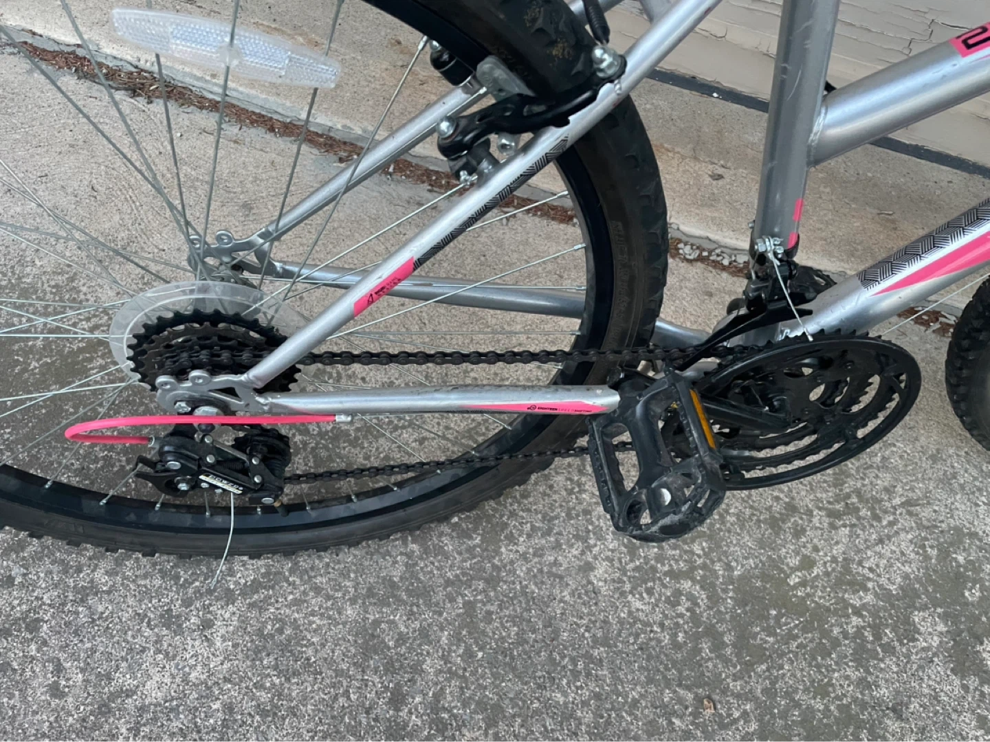 This is a Movel o kids mountain bike with a silver and pink frame. It's designed for easy riding on various terrains. Features hand brakes and a pink bell for fun!
