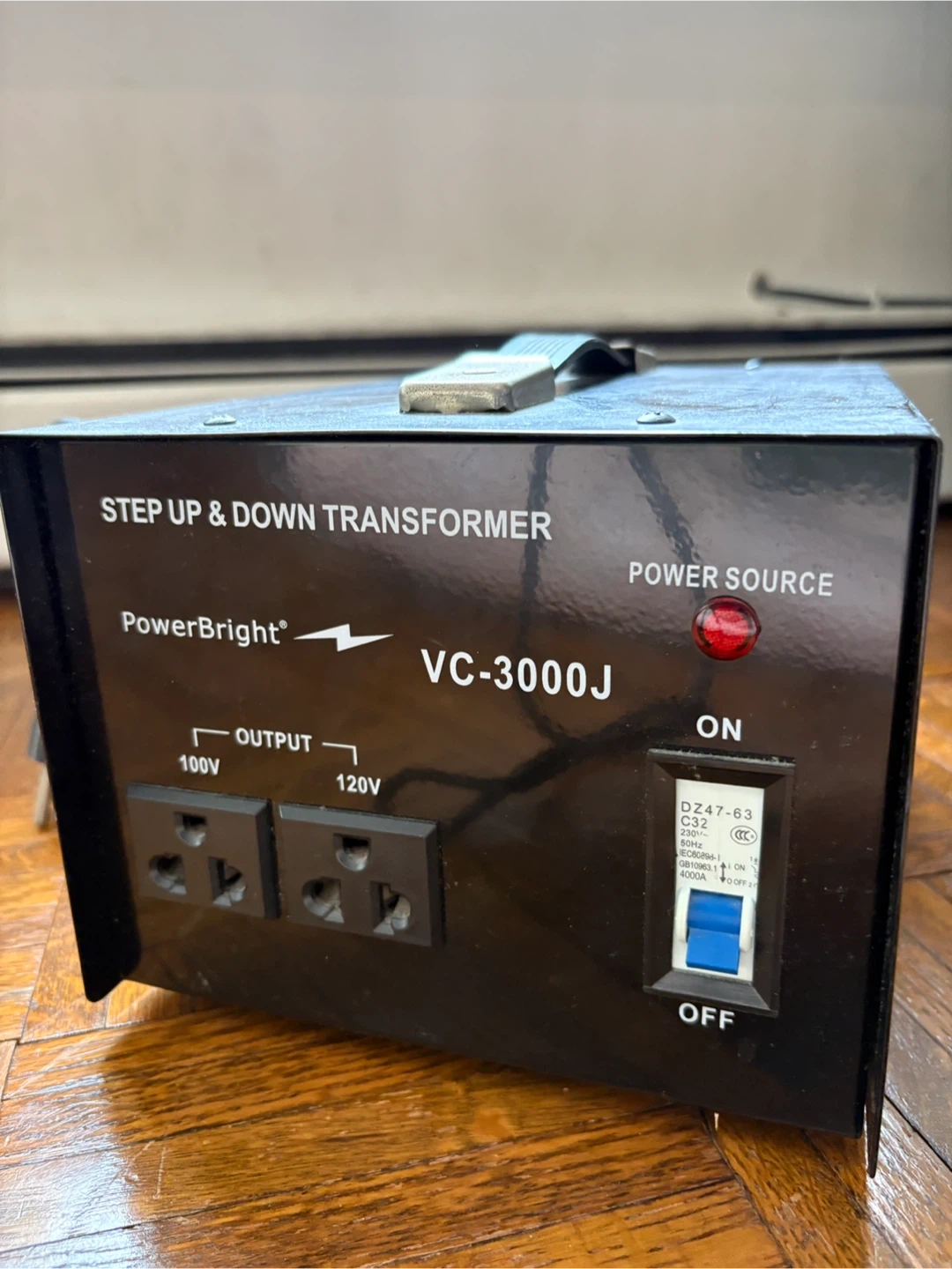 This is a PowerBright VC-3000J step up and down transformer. It features 100V and 120V output ports. Includes a power switch and indicator light.