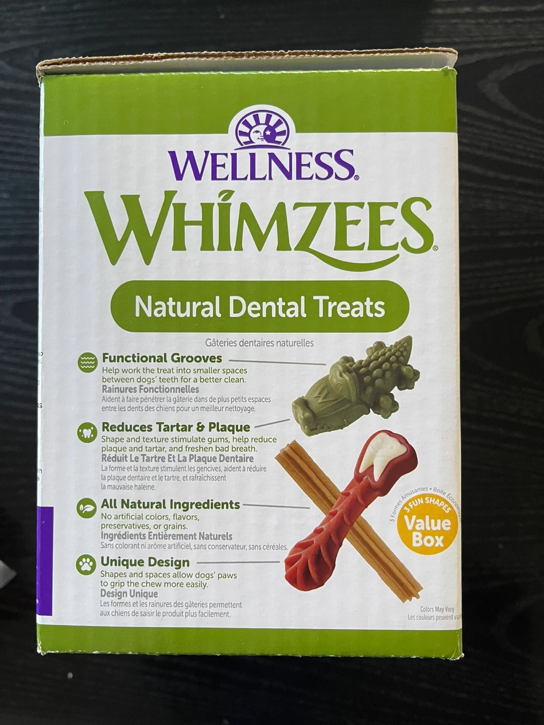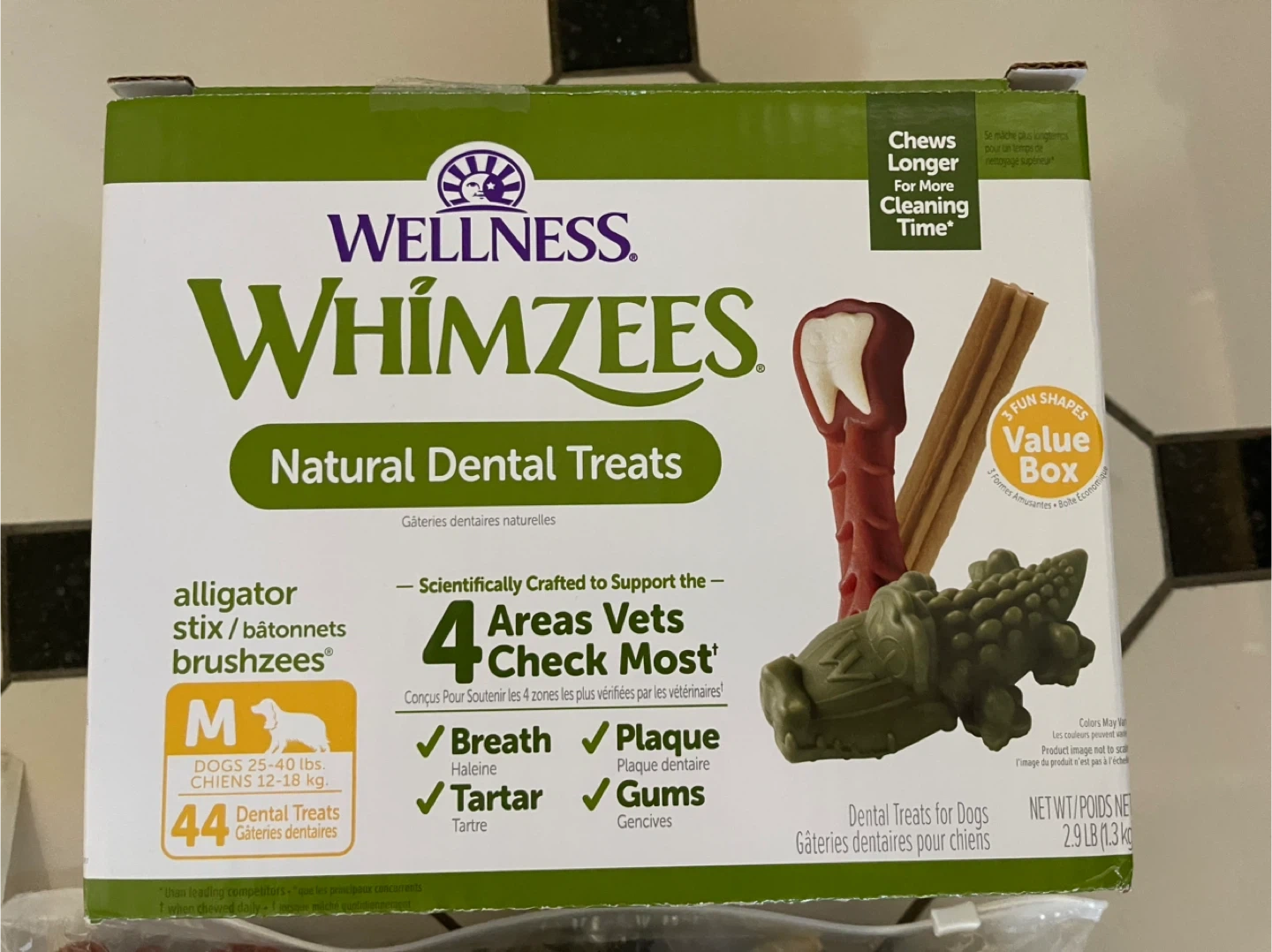 Selling a box of new Whimzees natural dental treats for dogs 12-18 kg. Bag of 44 treats is sealed. Expiry is May 2028.