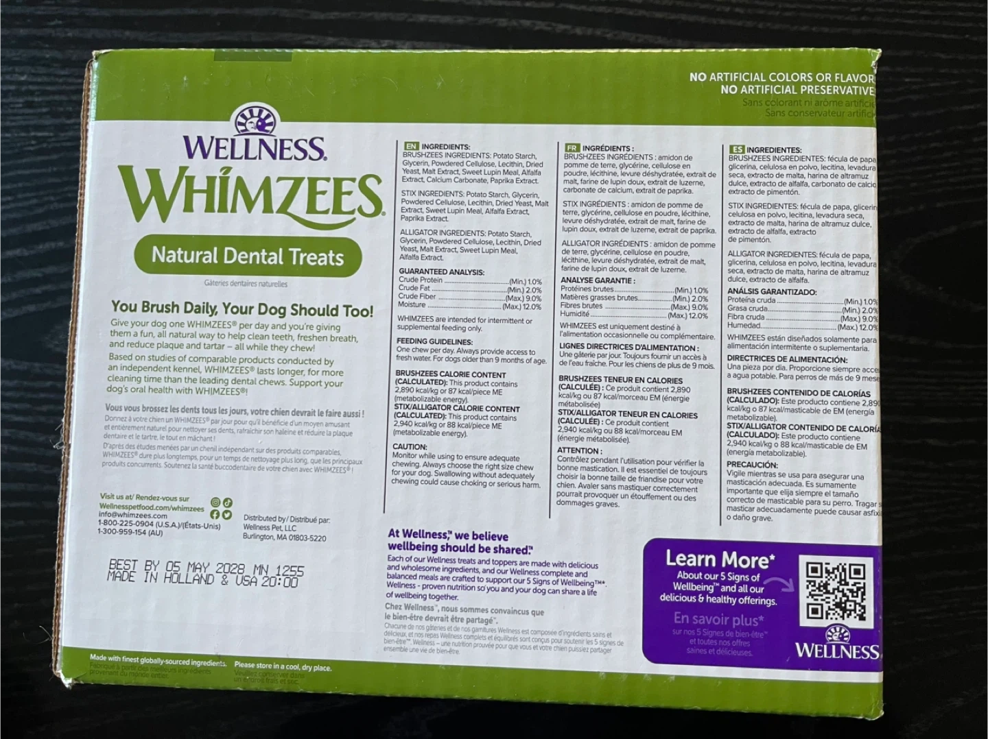 Selling a box of new Whimzees natural dental treats for dogs 12-18 kg. Bag of 44 treats is sealed. Expiry is May 2028.