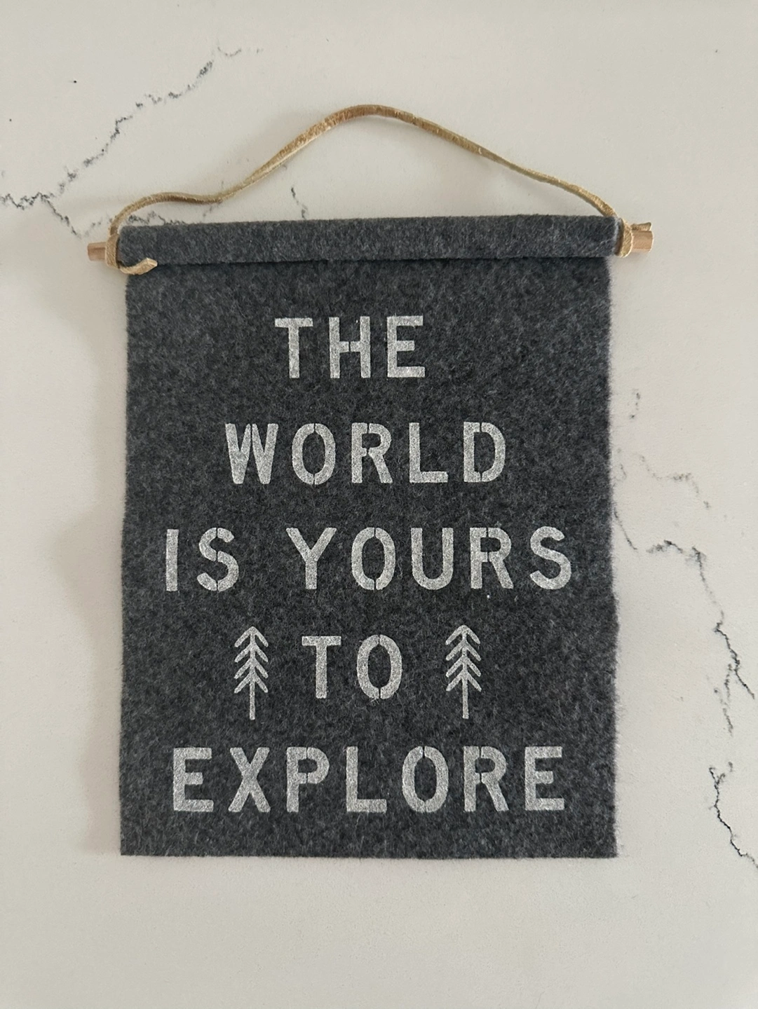 Adorable felt banner. Features the phrase "The World is Yours to Explore" in white lettering. Wooden dowel and leather strap for hanging. Perfect for a nursery or child's room.