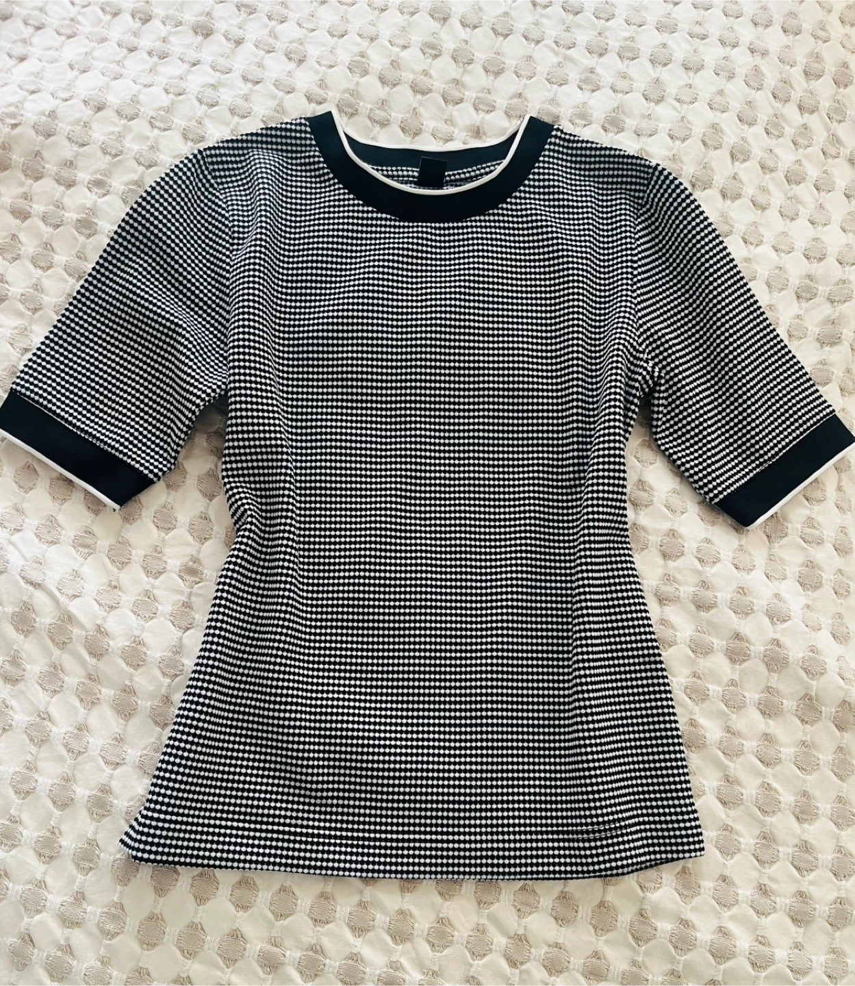 This is an Icône Par Simons top with a black and white patterned design. It features a classic crew neckline and short sleeves with contrasting trim. The fabric appears to be a textured knit.
