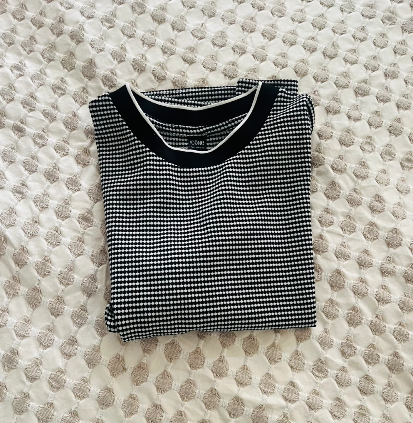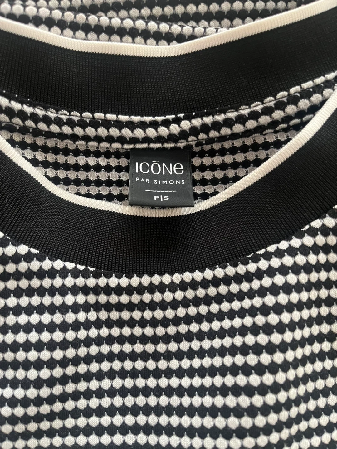 This is an Icône Par Simons top with a black and white patterned design. It features a classic crew neckline and short sleeves with contrasting trim. The fabric appears to be a textured knit.