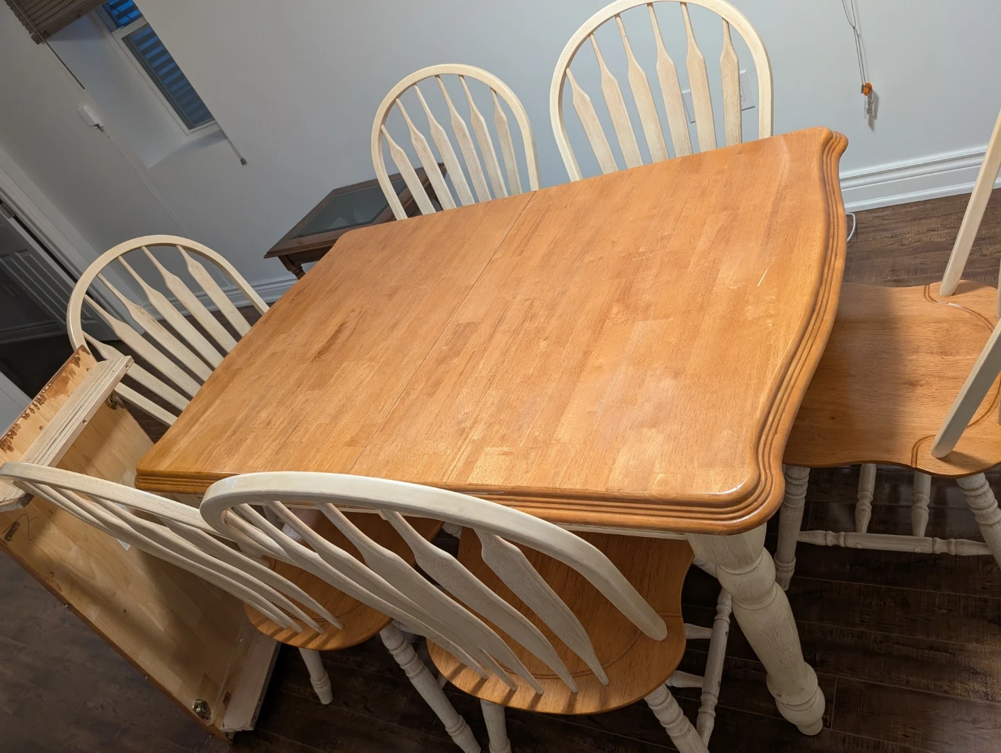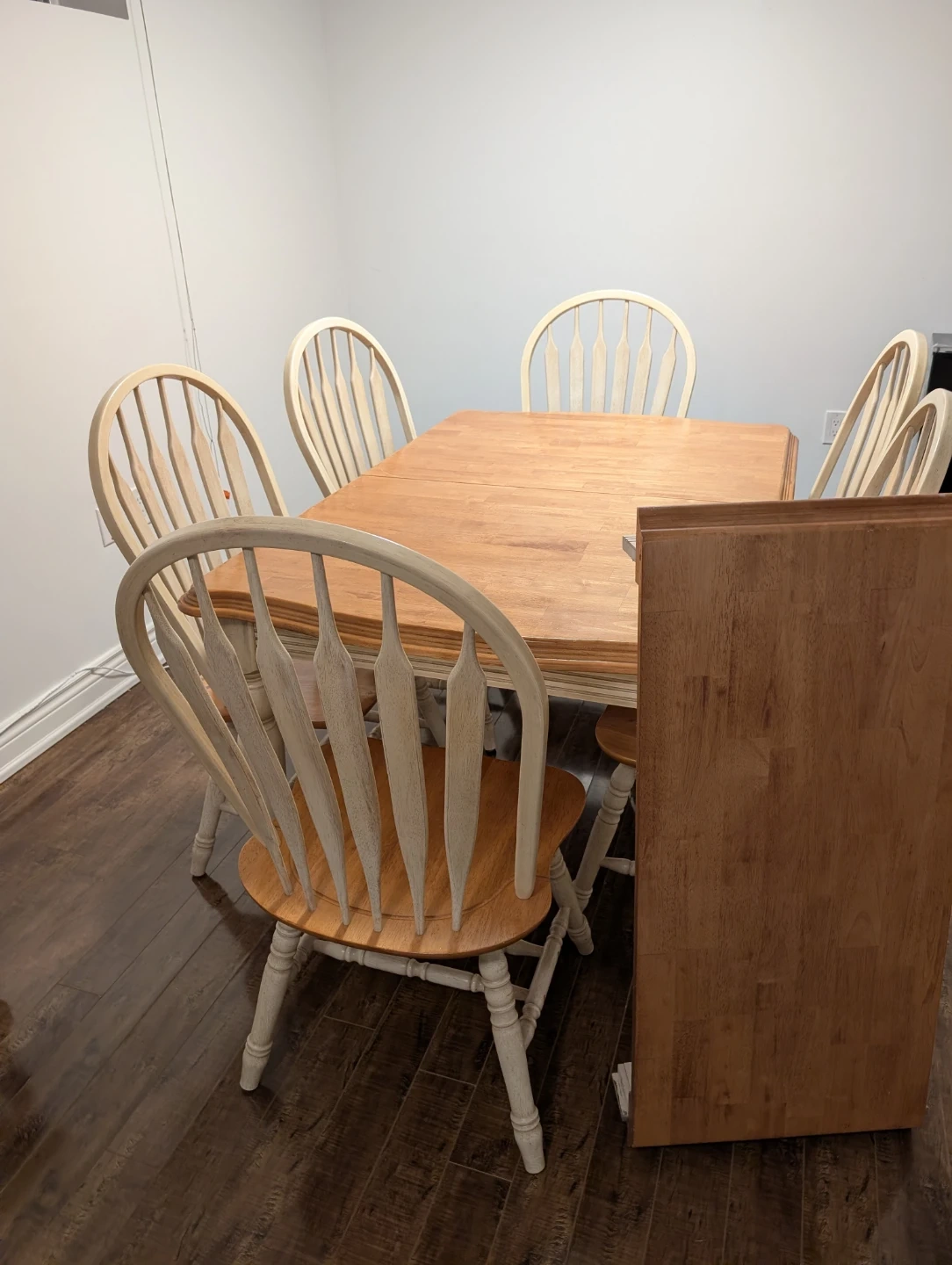 Selling a dining table with six chairs. The table is extendable with an extra leaf included. The chairs have a classic spindle back design and are very sturdy. It's a great set for family dinners or gatherings!