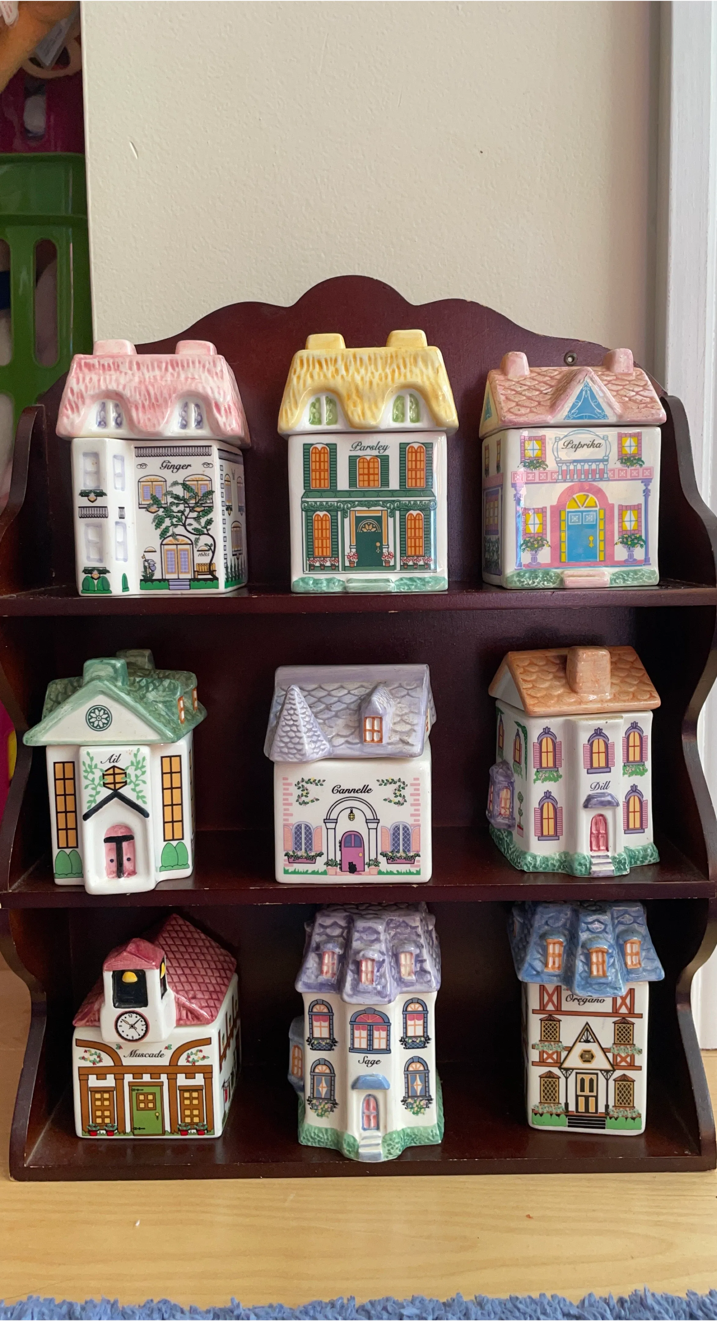 Selling a charming collection of vintage spice jars shaped like little houses! Each jar is labeled with a different spice name, such as Ginger, Parsley, Paprika, Dill, Sage, and Oregano. They're all in great condition and would make a lovely addition to any kitchen or collection