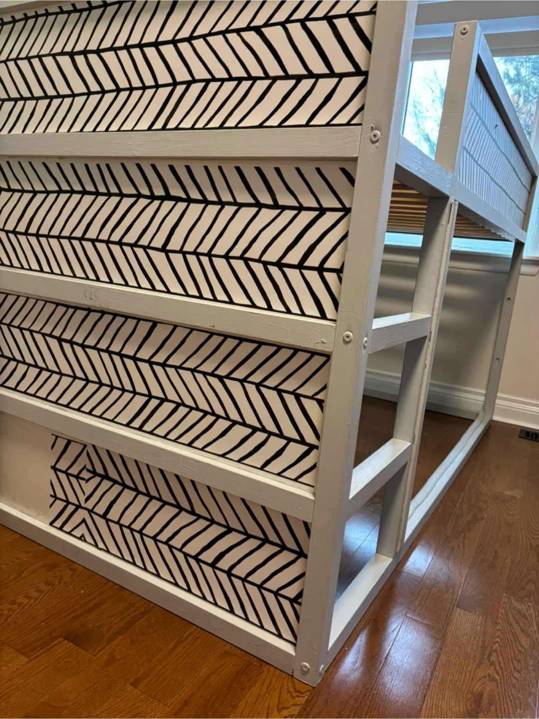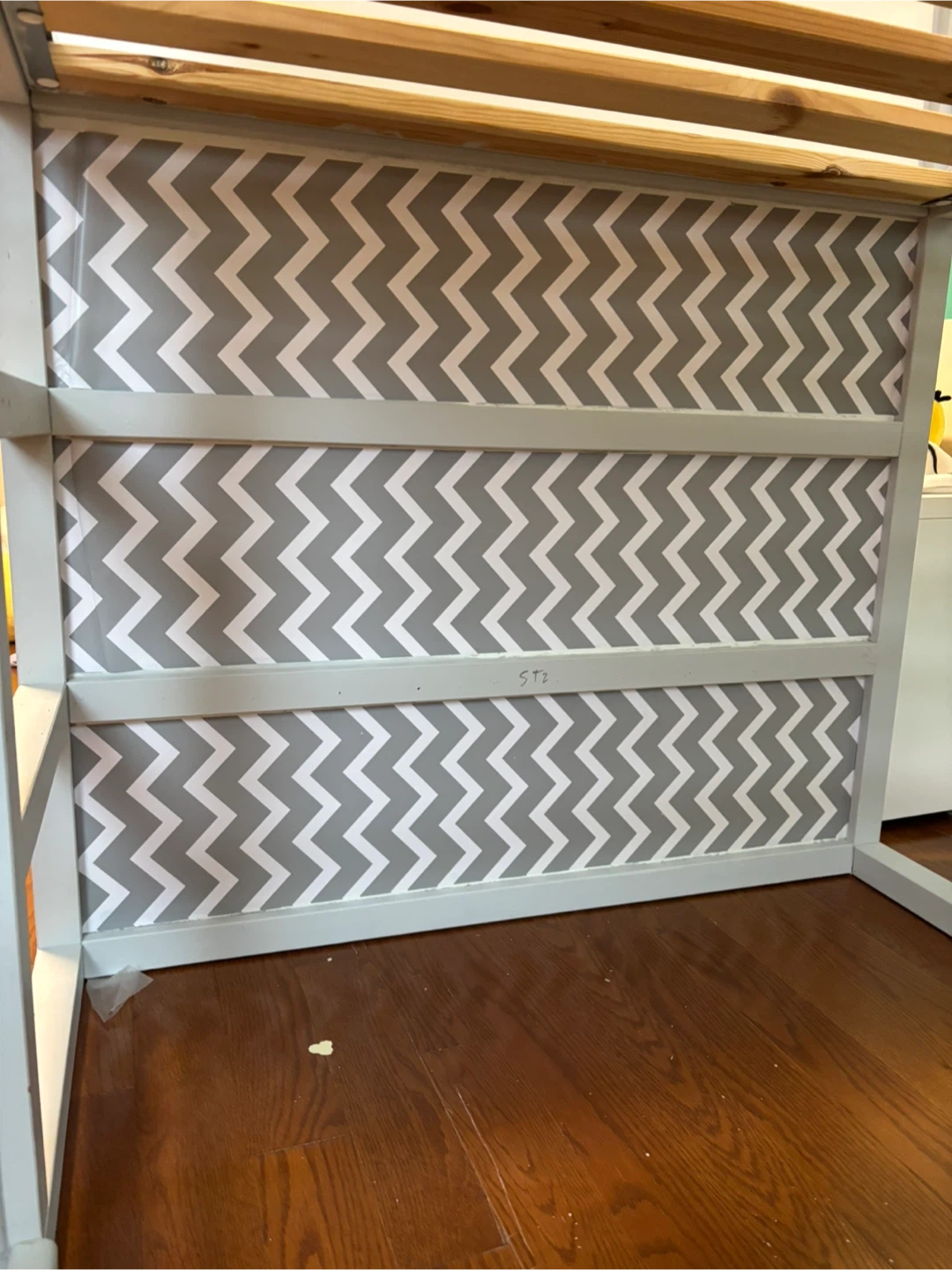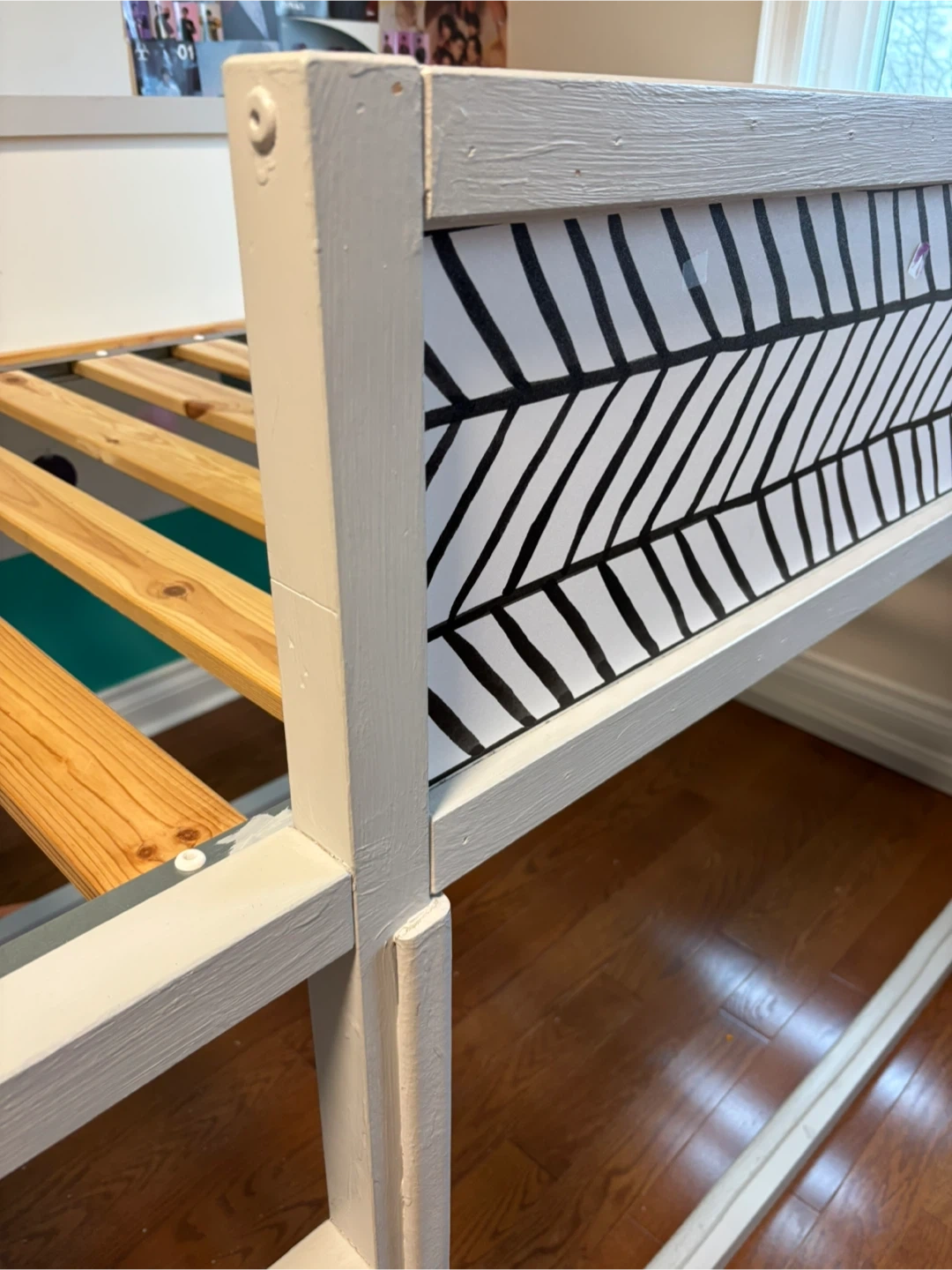 It was painted light grey with black and white herringbone decal on the panels - a small section missing that was covered with the night table. Makes it more fun than the birch colour from IKEA.