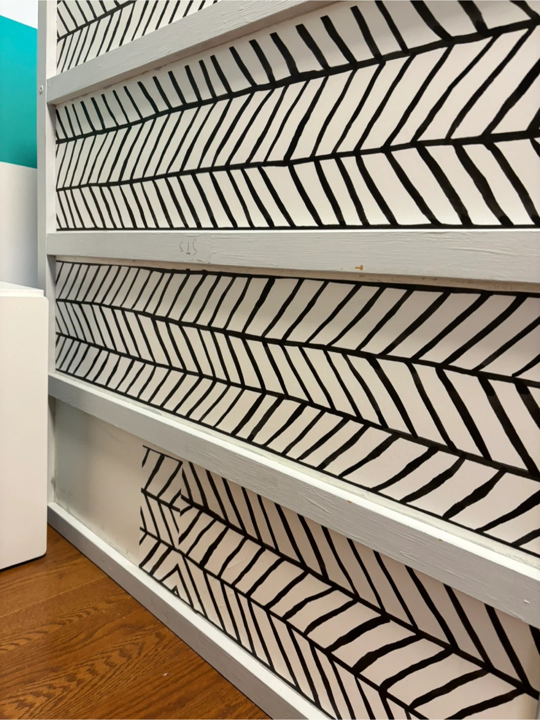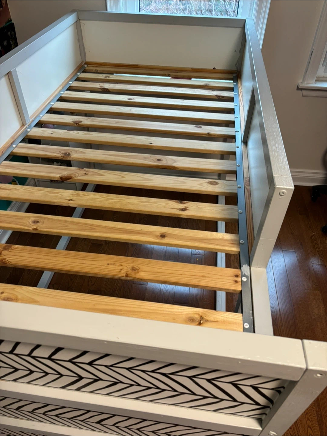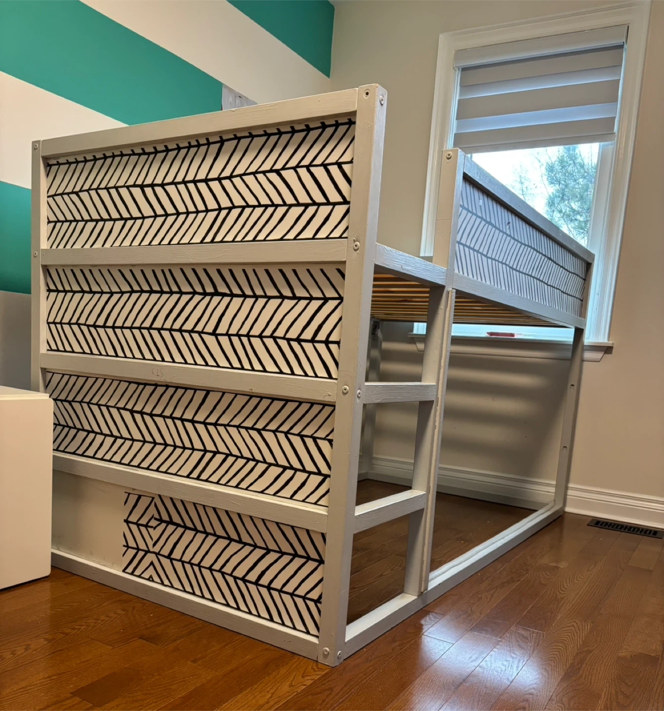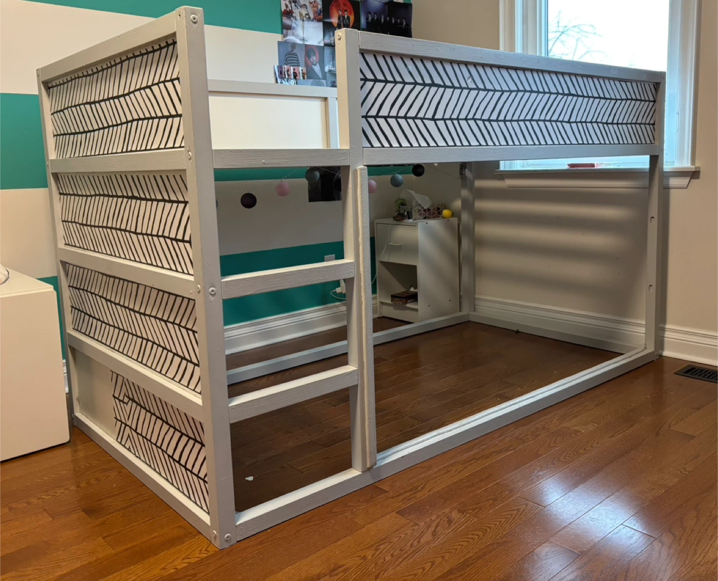 It was painted light grey with black and white herringbone decal on the panels - a small section missing that was covered with the night table. Makes it more fun than the birch colour from IKEA.