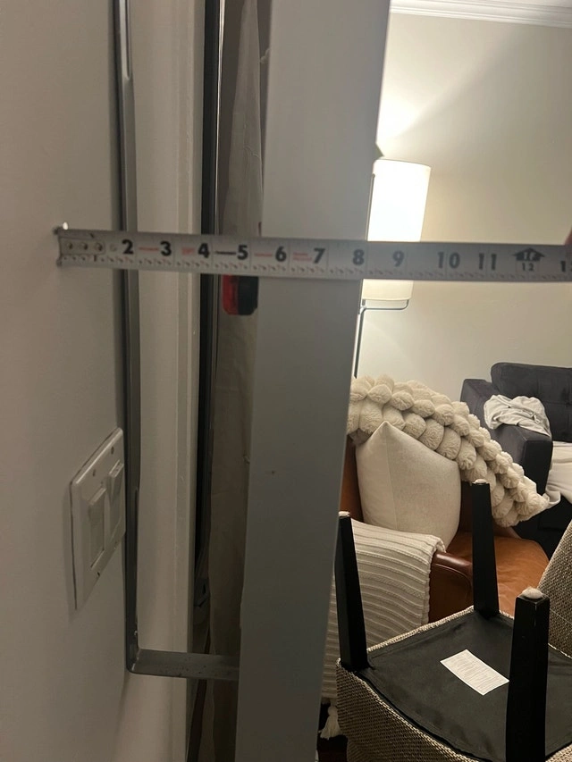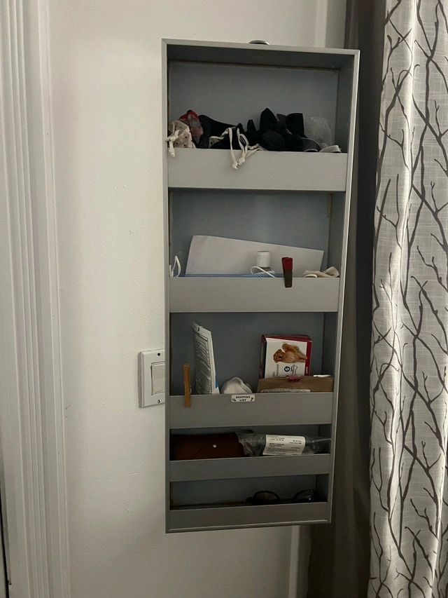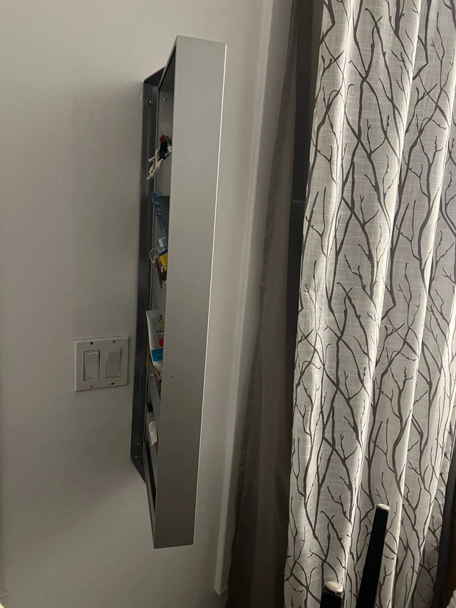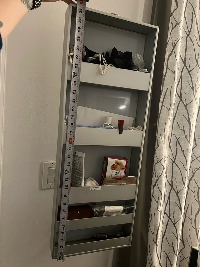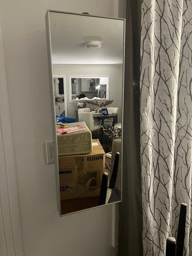 Wall mounted spinning mirror with storage. Mirror is 12” wide, 31 1/2” tall. Protrudes 8” from wall when shelf or mirror are facing out. Needs about 13” clearance to spin fully. See pics for details.