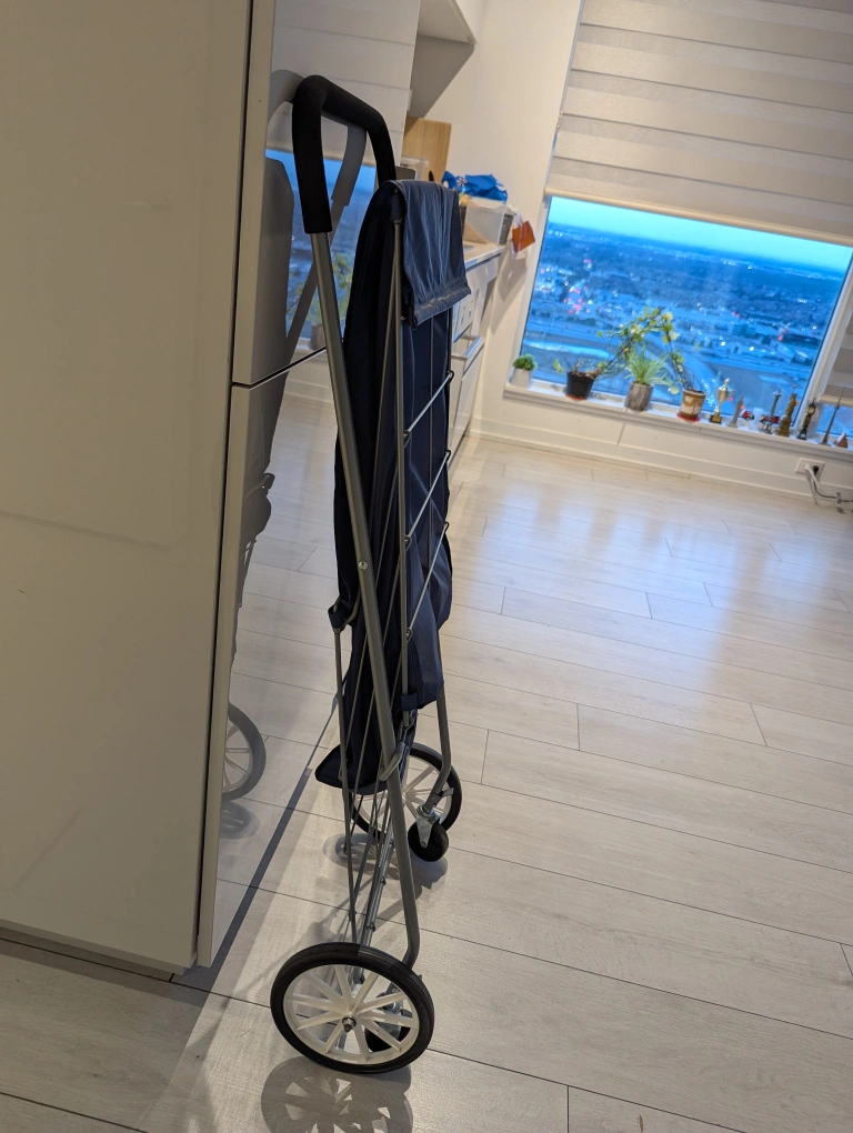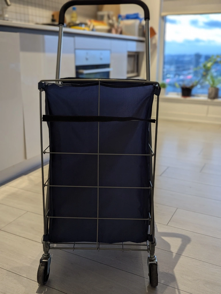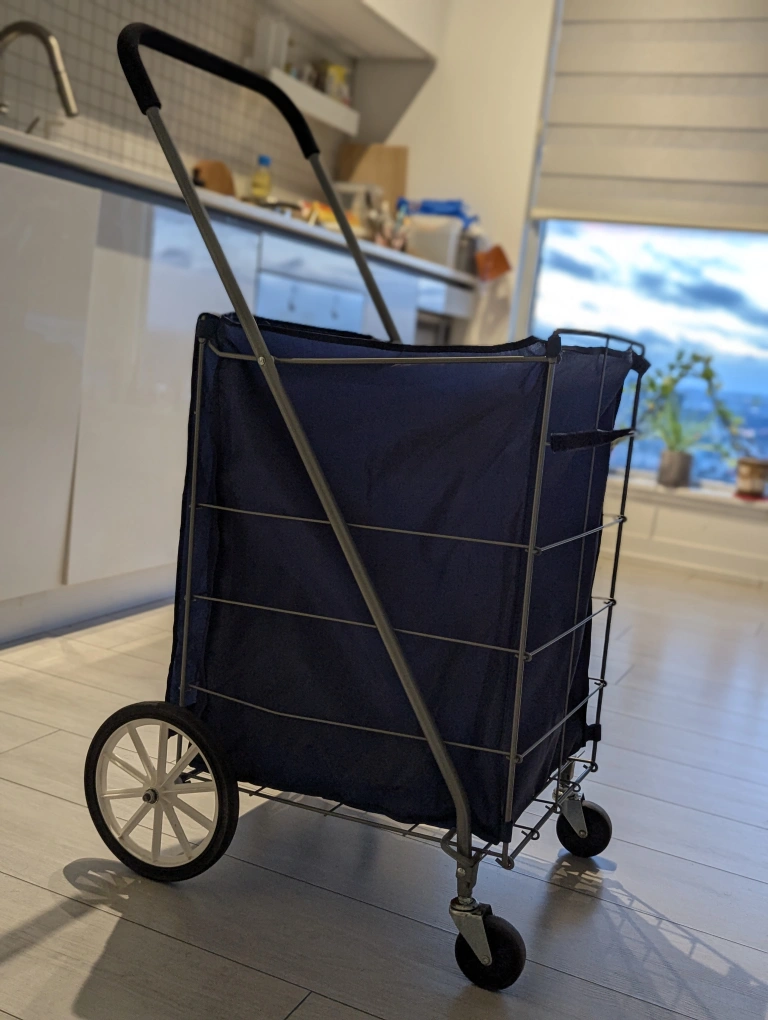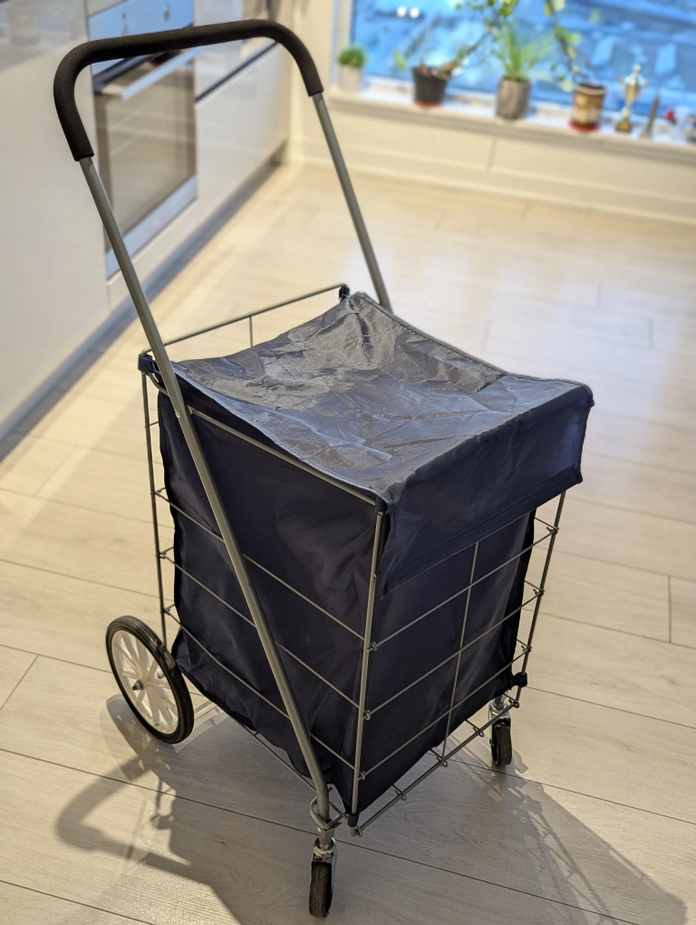 Collapsible shopping cart with a navy blue fabric liner. Four wheels, one is larger than the others. Has a handle.